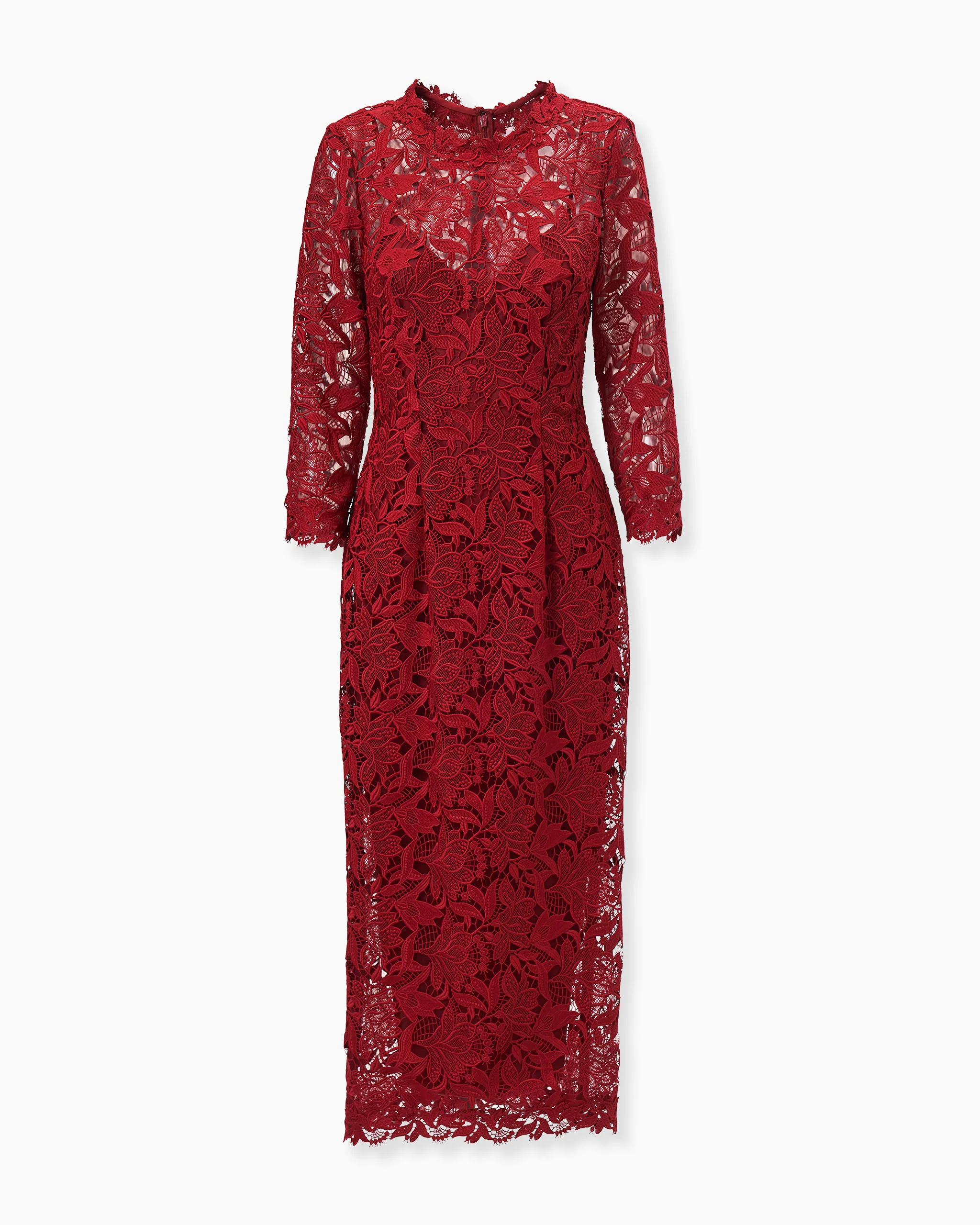This fitted midi dress showcases the season's tulip motifs in delicate guipure lace. Pair it with classic pumps and a chic clutch for an elegant, polished look. Lined SKU F2511N570TUF SIZE & FIT Close fit, midi length Midweight floral lace Model is 176cm/ 5’9” and is wearing a US 2 Bust: 34" Waist: 24.5" Hips: 35" COMPOSITION & CARE 100% Polyester Washing Instructions Dry Clean Only Made In Italy