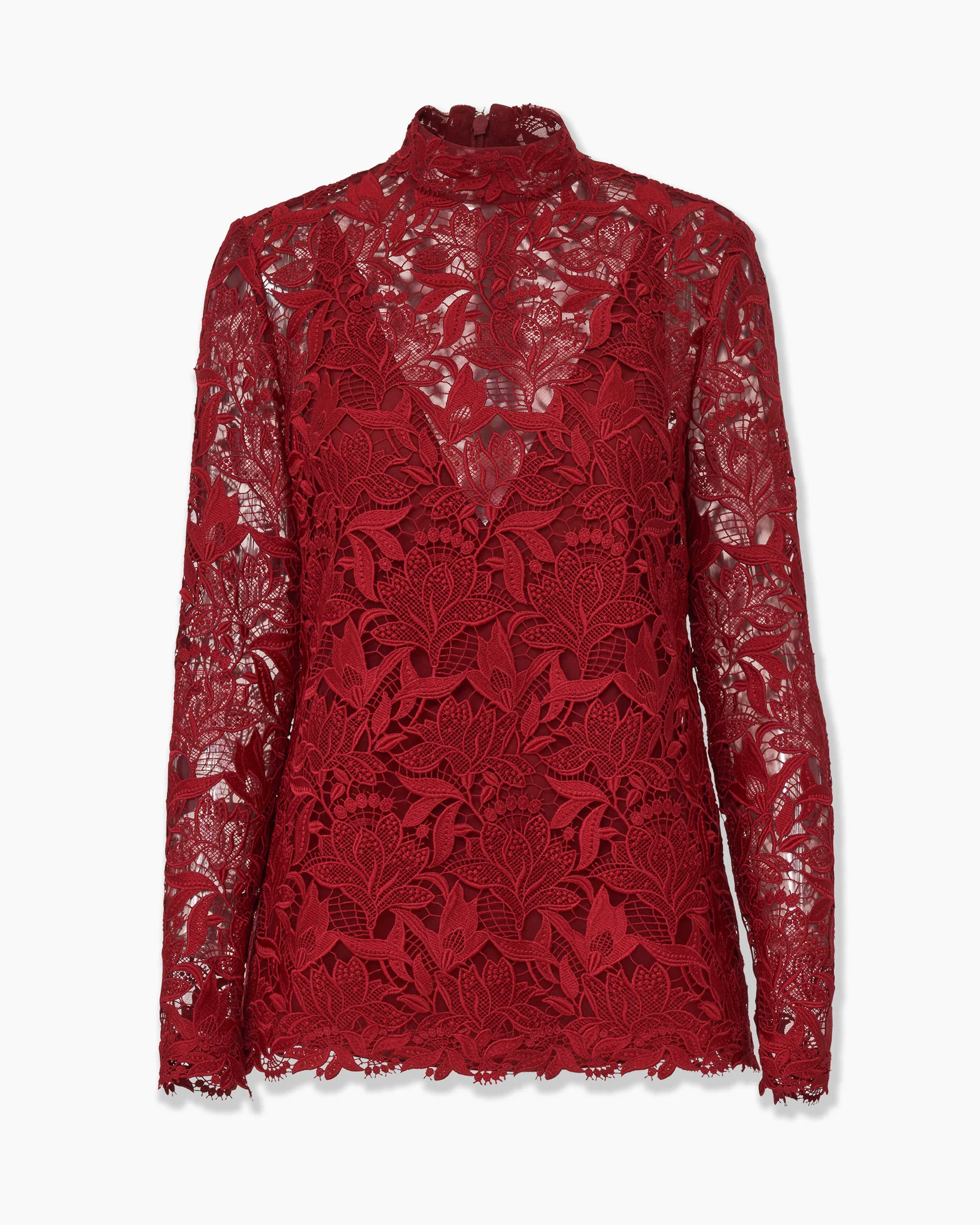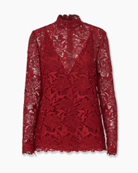The season's tulip motifs are rendered in intricate, textural guipure lace on this mock-neck top, which is finished with a scalloped hem and cuffs. Style it with the matching bootcut pants, as it was on the runway. Runway style Lined with a V-neck stretch cami SKU F2511N210TUF SIZE & FIT Regular fit Midweight floral lace Model is 179cm/ 5’11” and is wearing a US 2 Bust: 29.5" Waist: 22" Hips: 34.5" COMPOSITION & CARE 100% Polyester Washing Instructions Dry Clean Only Made in Italy