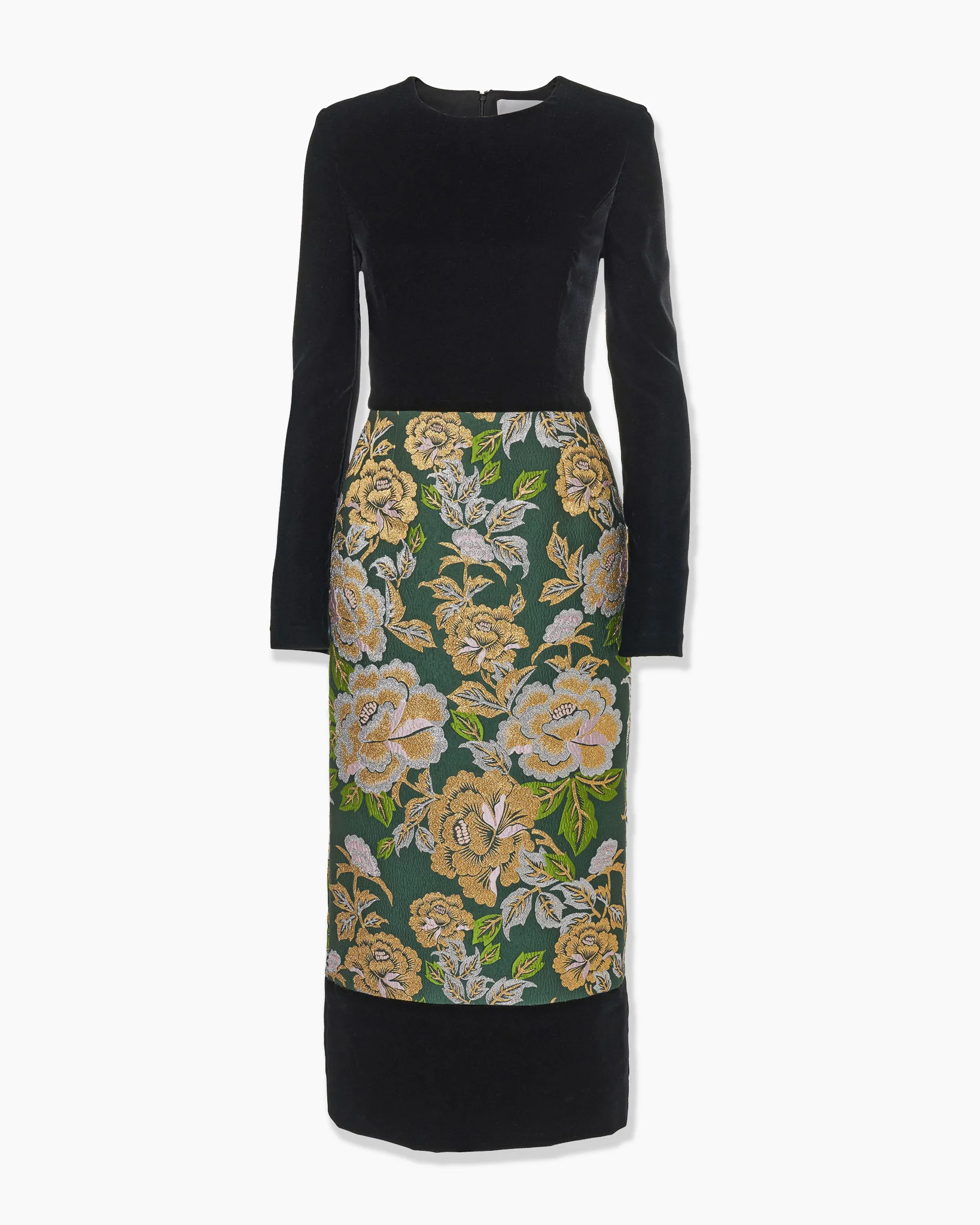 This opulent midi dress contrasts a stretch-velvet bodice with a metallic jacquard skirt woven with a vintage-inspired floral pattern. Its velvet-trimmed hem provides an exquisite finish. Runway style SKU F2511N548FLJ SIZE & FIT Close-fitting column silhouette, midi length Midweight jacquard Model is 178cm/ 5’10” and is wearing a US 2 Bust: 29" Waist: 23" Hips: 34.5" COMPOSITION & CARE 79% Polyester, 11% Polyester Metal, 10% Nylon Washing Instructions Dry Clean Only Made in United States of America
