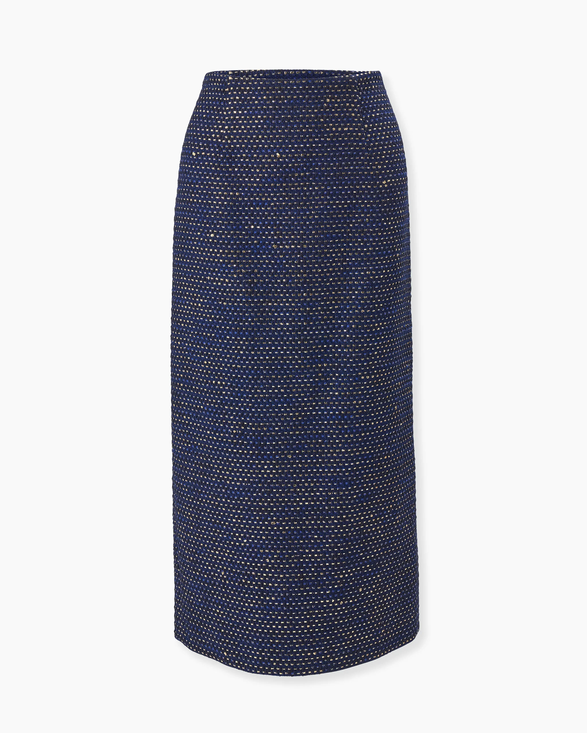 This elegant, form-fitting pencil skirt is crafted from midnight-blue tweed woven with shimmering gold lurex. Pair it with the matching jacket for a chic, coordinated look. SKU R2611N317LTW SIZE & FIT High-waisted, slim fit, midi length Midweight tweed Model is 178cm/ 5’10” and is wearing a US 2 Bust: 31" Waist: 24" Hips: 34.5" COMPOSITION & CARE 61% Cotton 31% Wool 4% Viscose 3% Metallic Fibre 1% Nylon Washing Instructions Dry Clean Only Made In Italy
