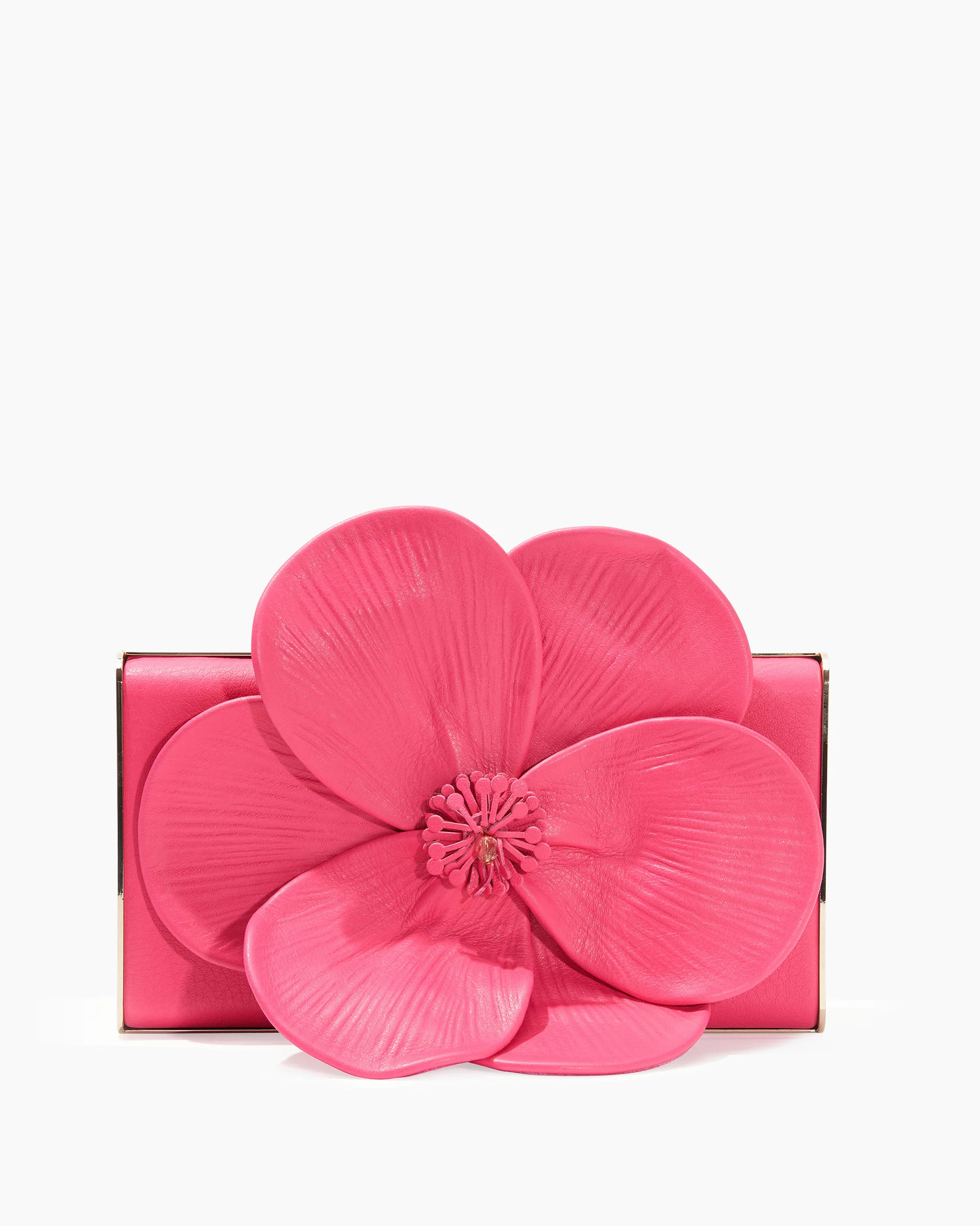 Topped with an oversized flower, this calfskin leather clutch will lend romance to any ensemble. SKU S2534N607LEA COMPOSITION & CARE 100% Leather Washing Instructions Spot Clean Only
