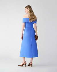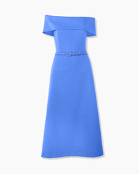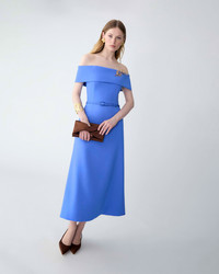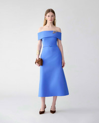 Inspired by sun-washed Aegean hues, this dress is crafted from Italian bi-stretch wool with an off-shoulder neckline and a flattering A-line silhouette. Accessorize it with a golden olive-branch brooch. Silicone tape along the inside top edge Brooch not included SKU R2611N559BWT SIZE & FIT Slim-fit bodice, flared midi skirt Heavyweight stretch-wool Model is 177cm/ 5’9” and is wearing a US 2 Bust: 31" Waist: 24" Hips: 35.5" COMPOSITION & CARE 97% Wool 3% Elastane Washing Instructions Dry Clean Only Made in Italy
