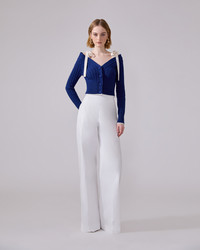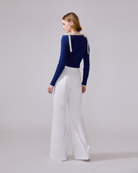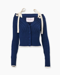 Knit in merino wool and cotton, this wide-ribbed cardigan is given a flirty twist with an off-shoulder neckline and knit ribbon straps. Off-the-shoulder neckline Buttoned front SKU E2512N102KCW SIZE & FIT Slim Fit Midweight ribbed stretchy knit Model is 178cm/ 5’10” and is wearing a US 2 Bust: 31" Waist: 23" Hips: 34" COMPOSITION & CARE 70% Cotton, 30% Virgin Wool Washing Instructions Dry Clean Only