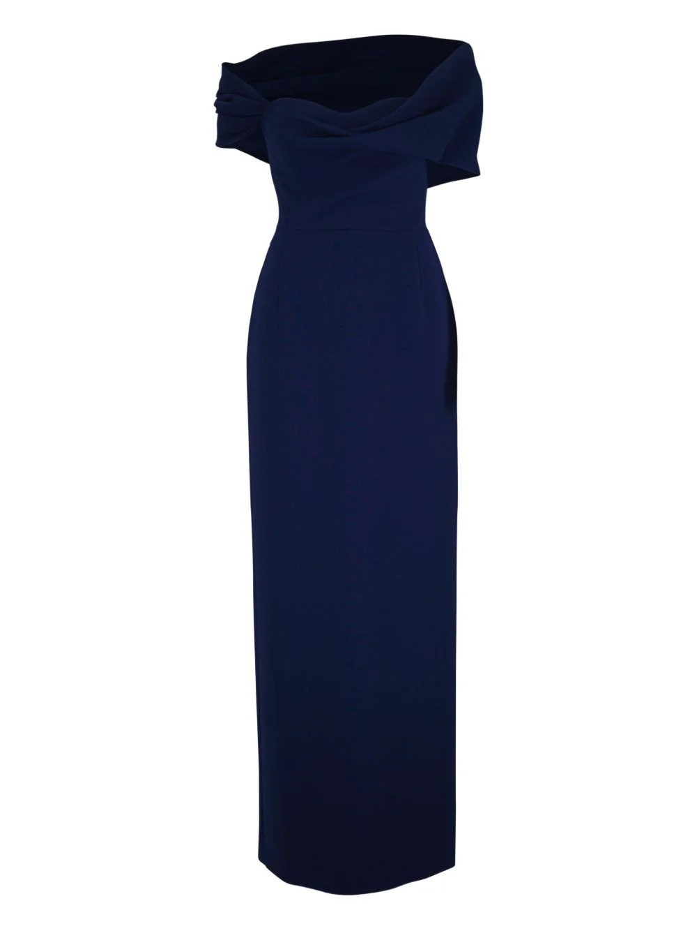 off-shoulder draped evening dress Highlights - Blue - Off-shoulder neckline - Draped bodice Made in United States Composition Polyester 92%, Polyurethane 8% Washing instructions Read Manufacturer Guidelines