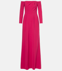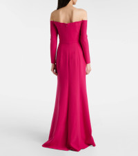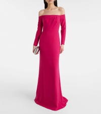 Crowned the best-dressed woman of all time, Carolina Herrera's namesake brand has a fashion prowess that reigns supreme. This gown boasts an off-shoulder silhouette with long sleeves and gentle draping at the neckline. Product Details - Material: 92% polyester, 8% polyurethane - Care instructions: dry clean - Made in the USA - Designer color name: Claret - Item color: pink - Lining: 100% polyester - Boning - Hook-fastening built-in bustier - Underwired cups - Padded cups - Cuff: zipped - Closure: concealed zipped back - Item number: P01103745 Size & Fit - Fits large to size - we recommend trying one size smaller - Off-the-shoulder - Internal corset with underwire support - Cinched waist - Non-stretchy fabric - Padded top - The model seen in the picture is 178cm-5'10" and wearing a size US 2