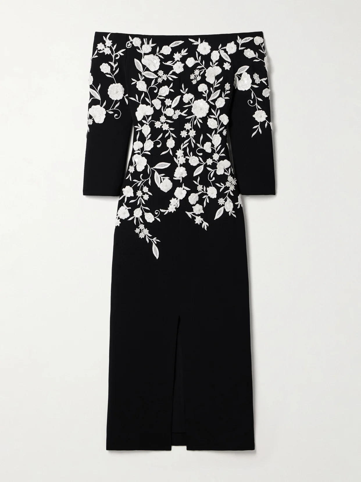 Undeniably romantic, Carolina Herrera's gown is intricately embroidered with flowers throughout the bodice - look closely and you'll see the blooms feature an array of beads, sequins and pearls to give them subtle texture. It's made from crepe with an off-the-shoulder neckline and has 3/4-length sleeves.