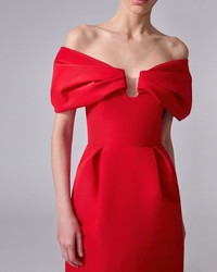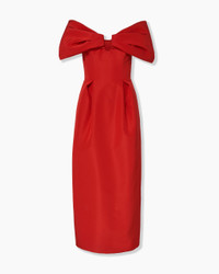 This strapless silk faille dress features dramatically puffed shoulders and an alluring U-neckline. Pleating at the skirt emphasizes the tailored waist. Wired neckline Side pockets Back slit SKU P2511N512SFA SIZE & FIT Close-fitting column silhouette, midi length Midweight silk-faille Model is 179cm/ 5’11” and is wearing a US 2 Bust: 29.5" Waist: 22" Hips: 34.5" COMPOSITION & CARE 100% Silk Washing Instructions Dry Clean Only Made in United States of America