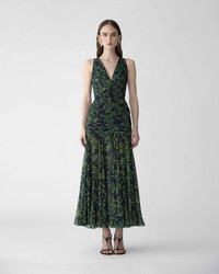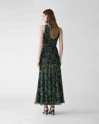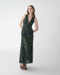 A plunging V-neckline and ruched waist give this silk chiffon dress a flattering silhouette. It is printed with olive branches inspired by the season’s classical Greek motifs. Decorative bow at center of chest Conceal zip closure at the back SKU R2611N575OBC SIZE & FIT Fitted bodice with A-line midi skirt Lightweight silk-chiffon Model is 175cm/ 5’9” and is wearing a US 2 Bust: 31.5" Waist: 23.5" Hips: 34.5" COMPOSITION & CARE 100% Silk Washing Instructions Dry Clean Only Made in United States of America