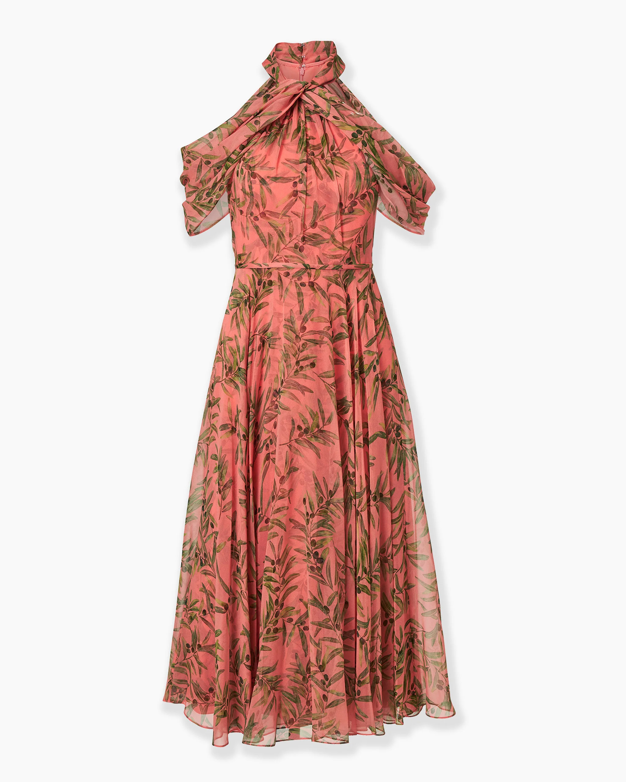 This floaty midi dress is crafted from layers of silk chiffon with a twisted halter neckline and softly draped off-the-shoulder sleeves. It is printed with olive branches inspired by the season’s classical Greek motifs. Halterneck Draped off-the-shoulder sleeves SKU R2611N537OBC SIZE & FIT Fitted bodice with A-line midi skirt Lightweight silk-chiffon Model is 175cm/ 5’9” and is wearing a US 2 Bust: 31.5" Waist: 23.5" Hips: 34.5" COMPOSITION & CARE 100% Silk Washing Instructions Dry Clean Only Made in United States of America
