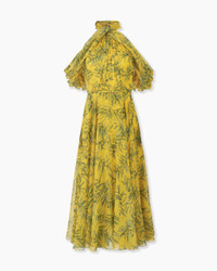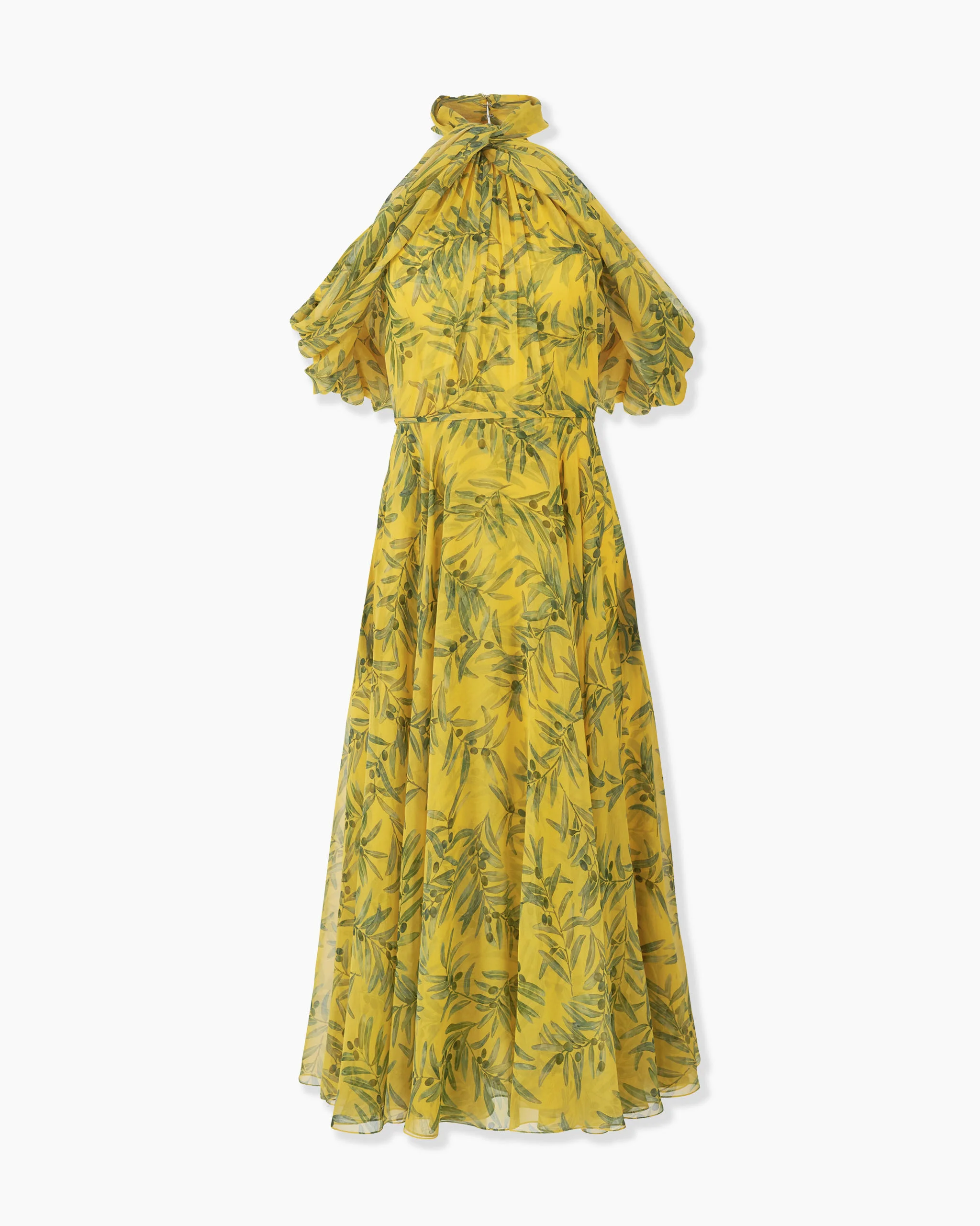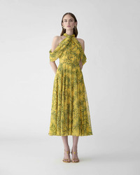 This floaty midi dress is crafted from layers of silk chiffon with a twisted halter neckline and softly draped off-the-shoulder sleeves. It is printed with olive branches inspired by the season’s classical Greek motifs. Halterneck Draped off-the-shoulder sleeves SKU R2611N537OBC SIZE & FIT Fitted bodice with A-line midi skirt Lightweight silk-chiffon Model is 175cm/ 5’9” and is wearing a US 2 Bust: 31.5" Waist: 23.5" Hips: 34.5" COMPOSITION & CARE 100% Silk Washing Instructions Dry Clean Only Made in United States of America