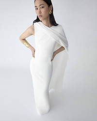 With flowing movement and a single draped shoulder, this white stretch-crepe gown evokes an ethereal elegance inspired by classical Greece. Style it with gold jewelry from the collection for a luminous finish. Back slit SKU R2611N722SFR SIZE & FIT Close-fitting column silhouette, maxi length with voluminous cape Midweight stretch-crepe Model is 179cm/ 5’9” and is wearing a US 2 Bust: 30" Waist: 24" Hips: 34" COMPOSITION & CARE 92% Polyester 8% Polyurethane Washing Instructions Dry Clean Only Made in United States of America