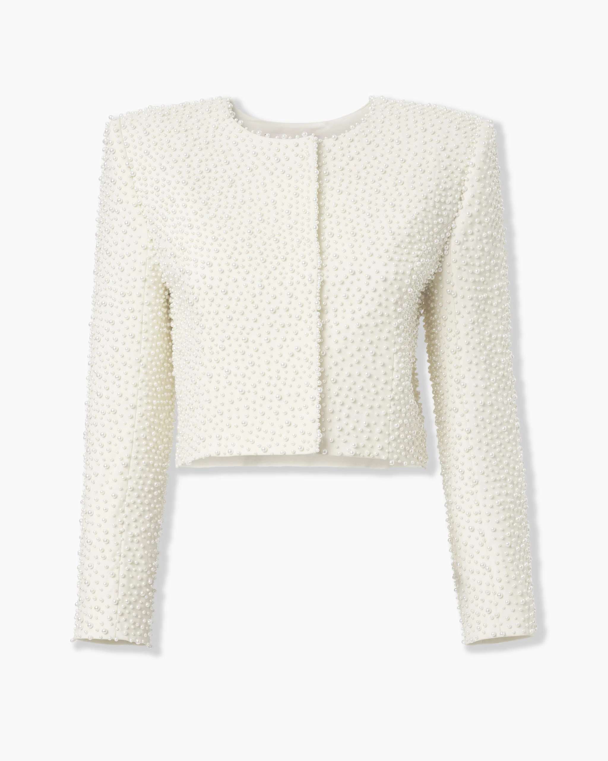 Bedecked in delicate pearls, this cropped stretch-wool jacket combines a minimal silhouette with refined embellishment. Pair it with its matching mini skirt for a chic monochrome look. Concealed snap closures at the front SKU C2611E104BWT SIZE & FIT Regular fit Heavyweight stretch-wool Model is 178cm/ 5’10” and is wearing a US 2 Bust: 32" Waist: 23.5" Hips: 34.5" COMPOSITION & CARE 97% Virgin Wool 3% Elastane Washing Instructions Dry Clean Only