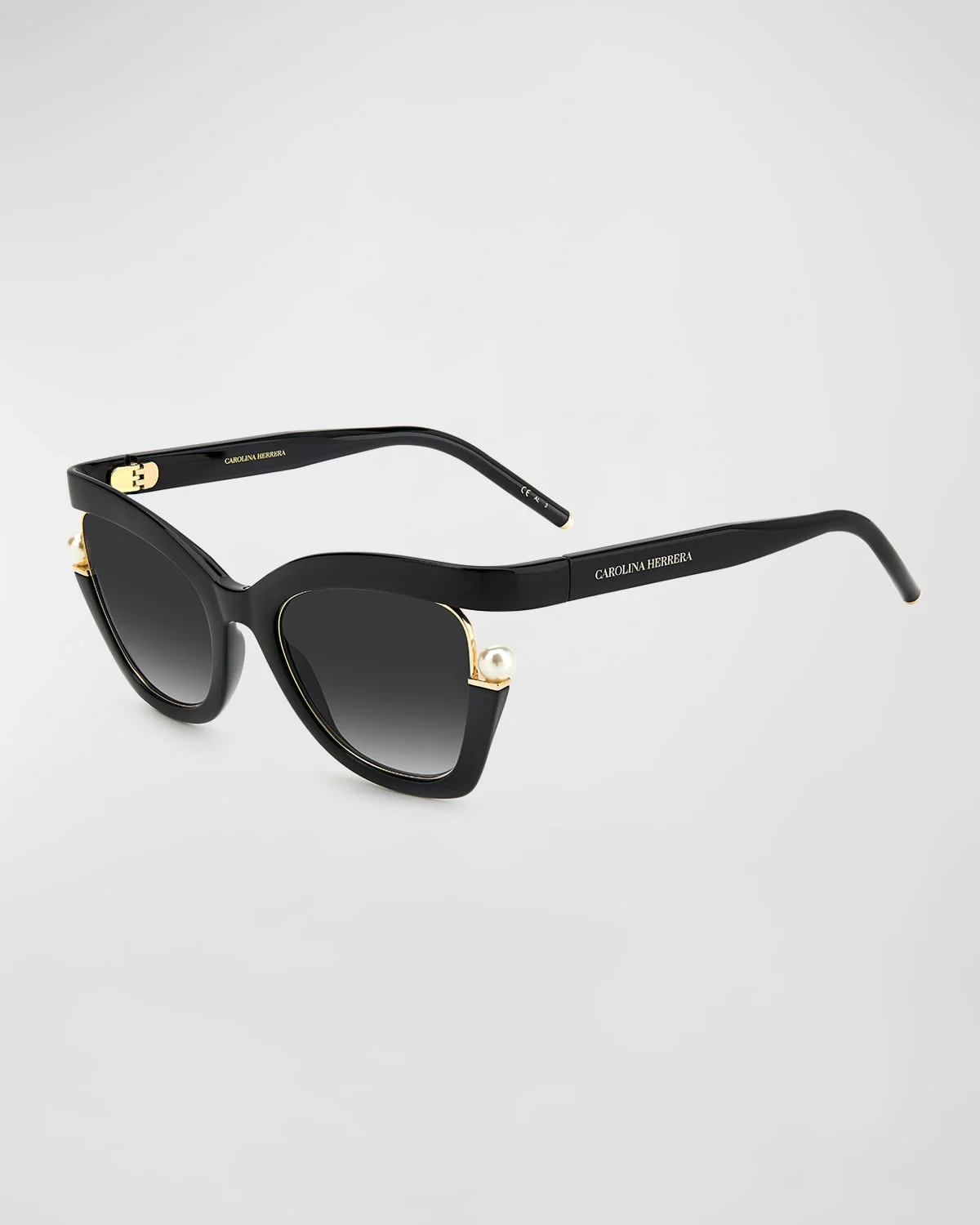 Carolina Herrera butterfly sunglasses in polyamide with faux pearl (plastic) accents Lens/bridge/temple (in mm): 5321140 Gradient lenses Signature logo on temples Thin, tapered arms 100% UVA/UVB protection Imported