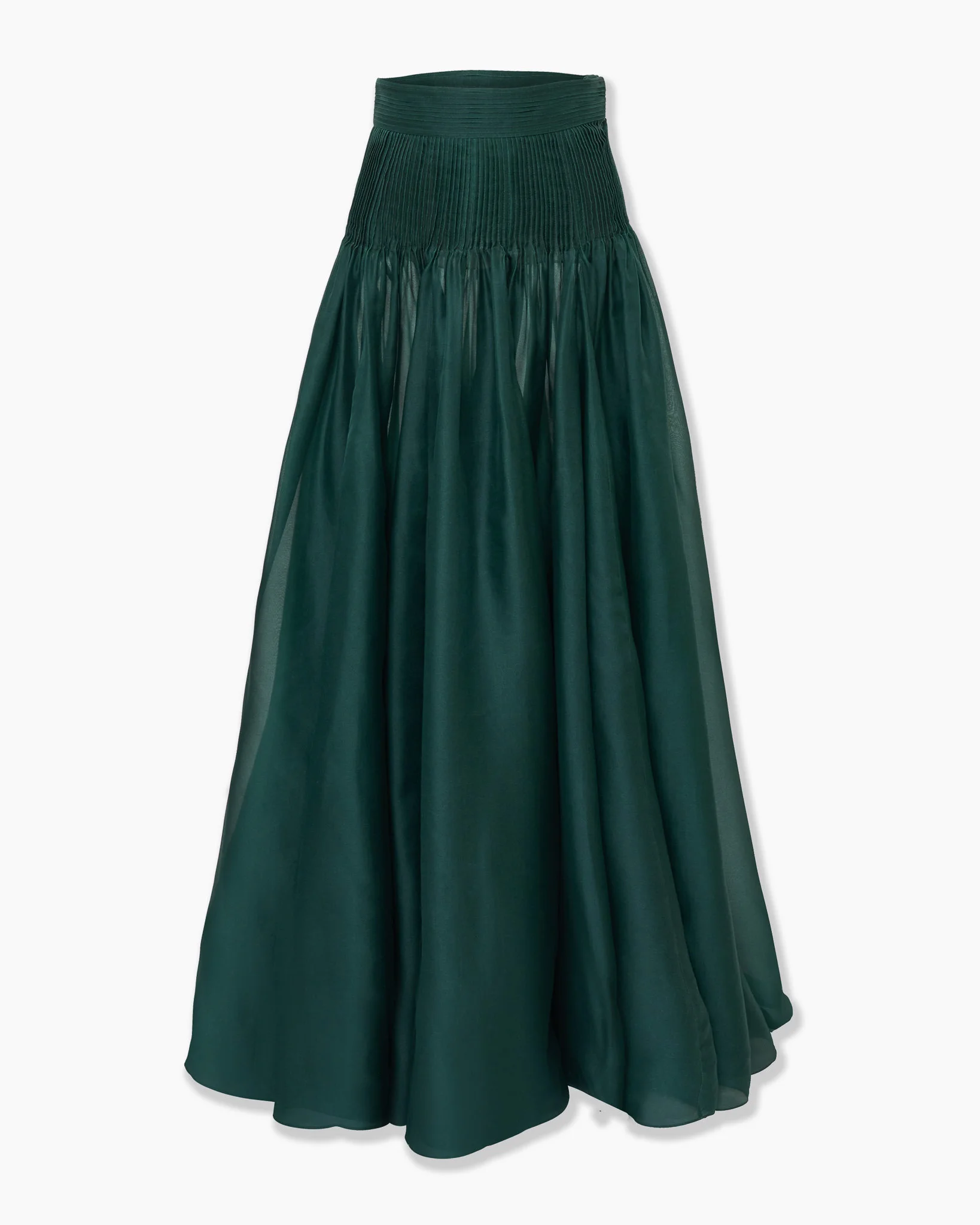 Sheer silk-organza meets sharp, structured detailing in this flowing skirt, meticulously defined with pintuck pleats that cinch the waist and release into a voluminous, billowing silhouette. Style it with the matching blouse. Runway style Fully lined SKU F2511E319CRG SIZE & FIT Loose fit maxi with skirt Lightweight silk-crepe Model is 178cm/ 5’10” and is wearing a US 2 Bust: 29" Waist: 23" Hips: 34.5" COMPOSITION & CARE 100% Silk Washing Instructions Dry Clean Only