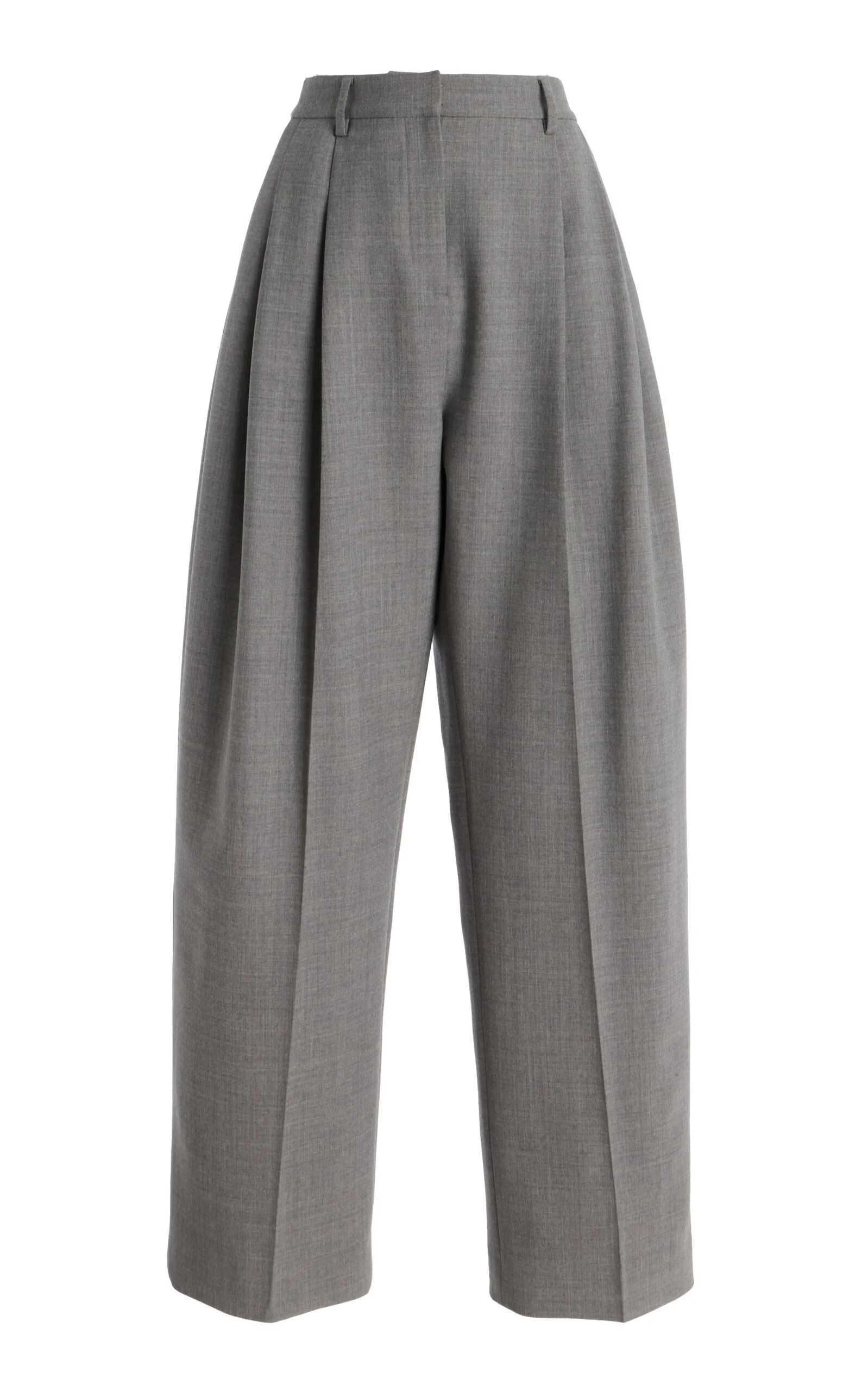 PRODUCT DETAILS - Fall '25 - Regular fit, mid rise, belt loops, pleating, wide leg - Zipper fastening - Composition: 97% Virgin Wool, 3% Elastane - Color: Melange Grey - Dry clean - Made in the USA
