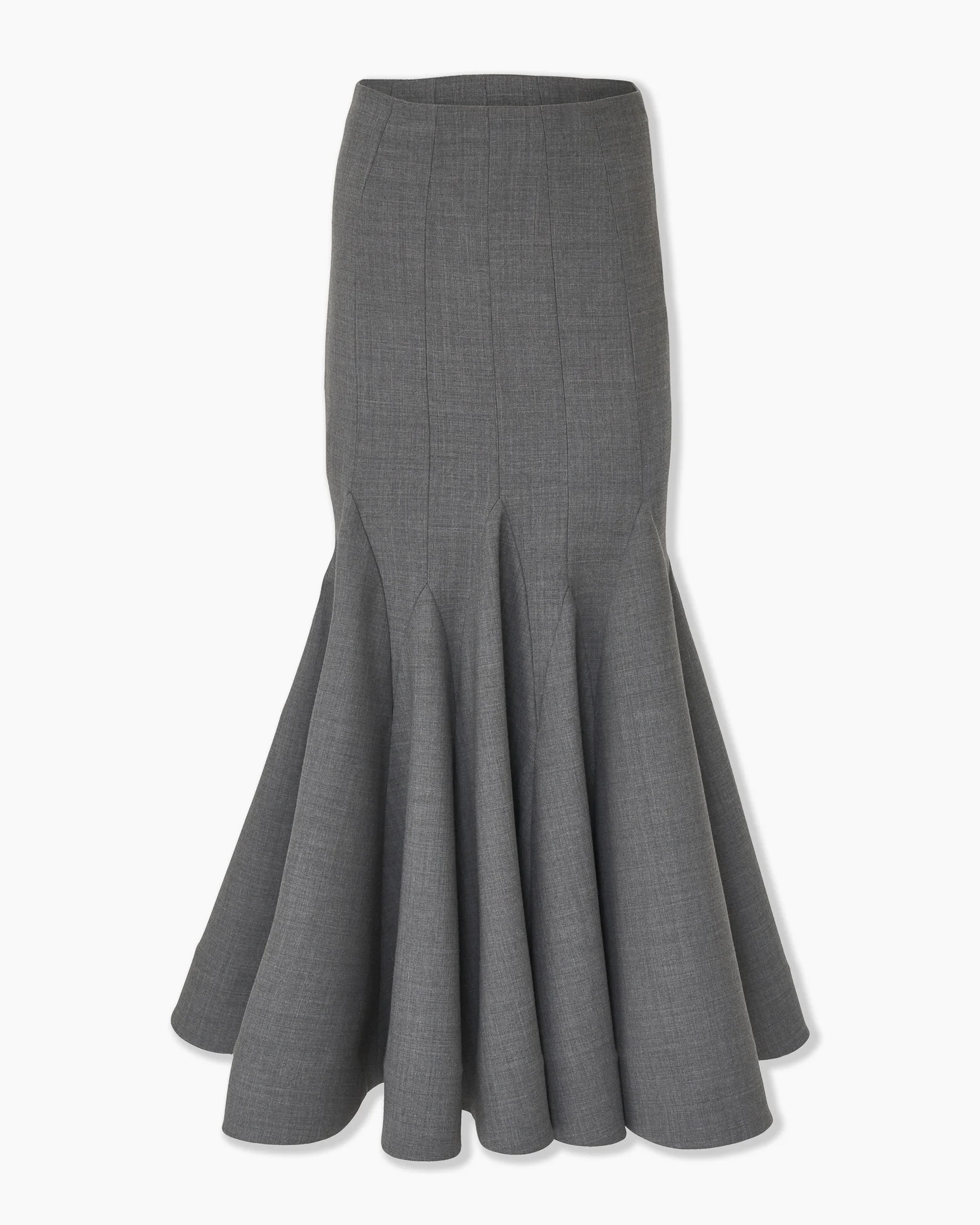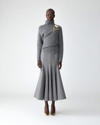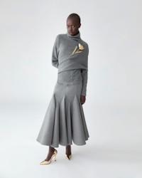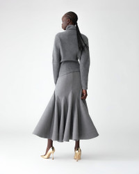 This stretch-wool midi skirt is tailored with multi-layered godets, creating a dramatic flared silhouette and flowing movement with every step. Style it with the Asymmetric Turtleneck Sweater, as seen on the runway. Runway style Concealed zip fastening at the back SKU F2511N302BWT SIZE & FIT Close-fitting up to the thigh, flared hem, midi length Heavyweight stretch-wool Model is 179cm/ 5’11” and is wearing a US 2 Bust: 29.5" Waist: 22" Hips: 34.5" COMPOSITION & CARE 97% Virgin Wool, 3% Elastane Washing Instructions Dry Clean Only Made in United States of America