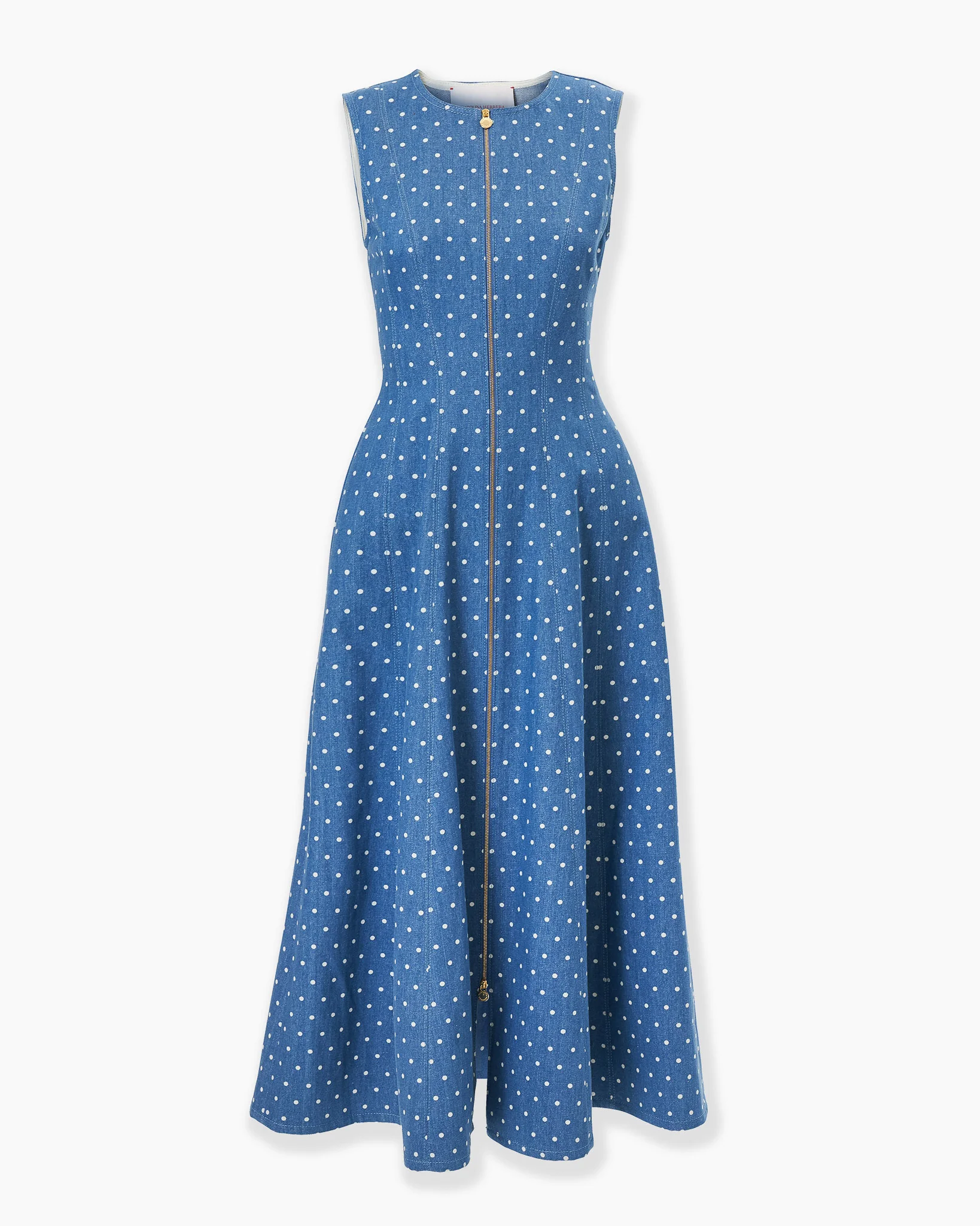 Cut from Italian denim with a playful polka dot print, this A-line dress features flattering vertical seams and a double zipper at the front for versatile styling. Exposed zip fastening at the front SKU S2611N502MND SIZE & FIT Close-fitting up to the waist, midi skirt Midweight mini-dot print denim Model is 177cm/ 5’9” and is wearing a US 2 Bust: 34" Waist: 24.5" Hips: 35" COMPOSITION & CARE 100% Cotton Washing Instructions Dry Clean Only Made in Italy