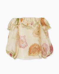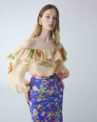 Cut from lightweight crepe organza printed with soft poppies, this off-the-shoulder top features voluminous puff sleeves and a gently layered ruffle neckline, enhancing its floaty, romantic feel. Off-the-shoulder neckline Neckline elasticized at the sleeves and back SKU R2611N213PRG SIZE & FIT Regular fit Lighweight silk-organza Model is 178cm/ 5’10” and is wearing a US 2 Bust: 32" Waist: 23" Hips: 34" COMPOSITION & CARE 100% Silk Washing Instructions Dry Clean Only Made in United States of America