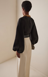 PRODUCT DETAILS - Voluminous puff sleeve, crewneck, slim fit - Button fastening through back - Composition: 100% Silk - Color: Black - Dry clean - Made In: United States of America - R26 Chalet