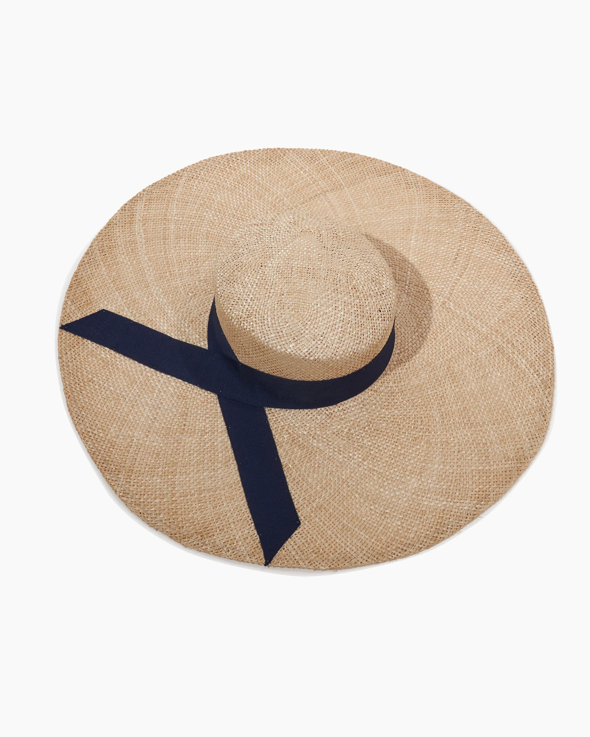 Exude effortless chic in this wide-brimmed sun hat, crafted from natural raffia straw with ribbon ties. SKU E2551N700RAF COMPOSITION & CARE 100% Raffia Washing Instructions Clean with a soft, dry cloth Made in United States of America