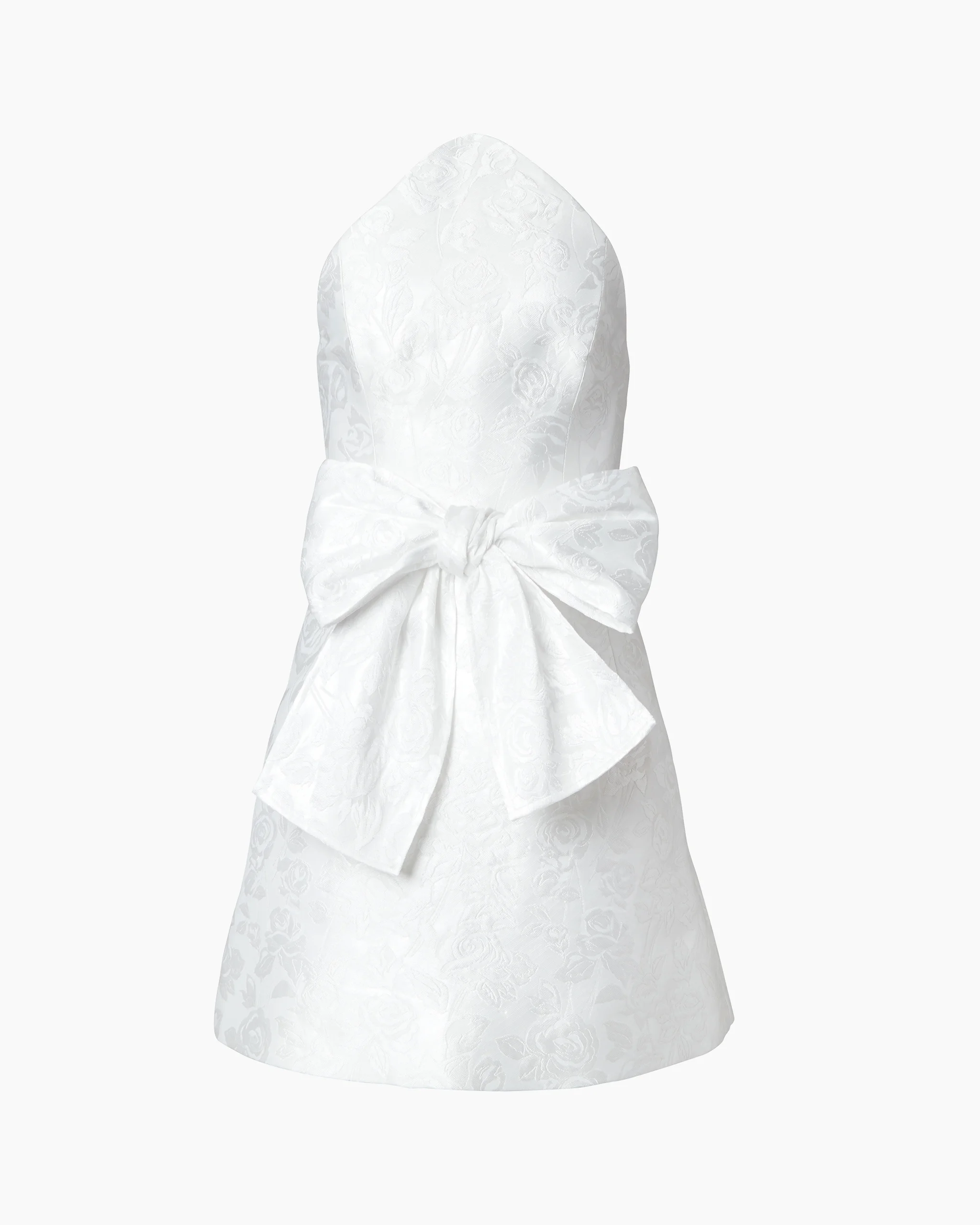 Vow to wow in this stunning mini dress, cut from shimmering rose jacquard with a triangular neckline and a pretty bow at the waist. Curved neckline Fixed bow Side pockets Lined Length shoulder to hem: 35.5 inches Fit Fits true to size Model Measurements Model is 178cm/ 5’10” and is wearing a US 2 Composition 82% Polyester, 10% Polaymid, 8% Metallic Fiber Washing Instructions Dry Clean Only Made in USA SKU R2311N539RJA