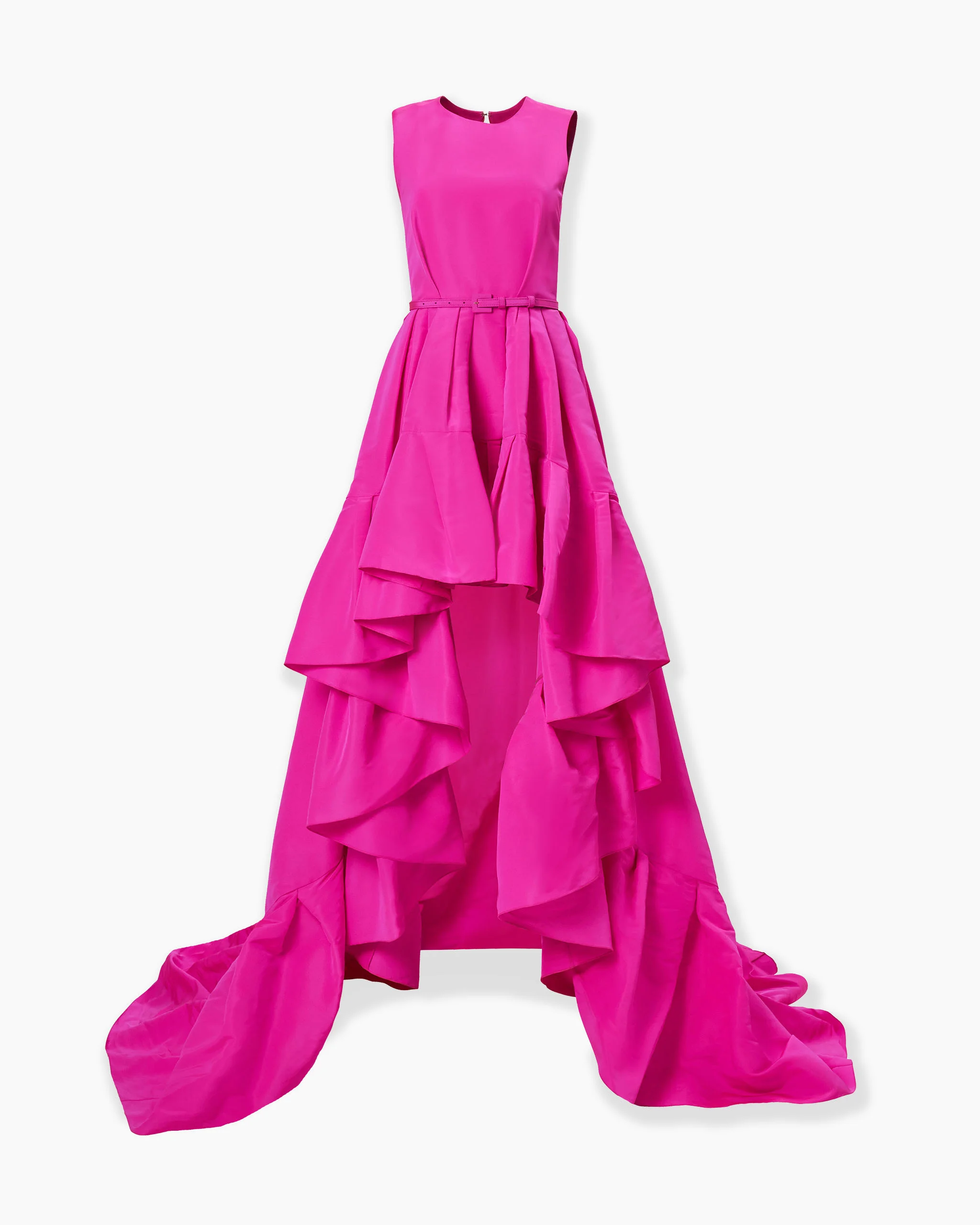 Cut from lustrous hot pink silk faille, this sleeveless gown captures the collection’s spirit of radiant femininity. Its tiered high-low hem falls into a sweeping train that evokes a sense of regal drama and joyful movement. Runway style Concealed zip fastening at the back SKU S2611N730SFA SIZE & FIT Close-fitting up to the waist, voluminous high-low skirt Midweight silk-faille Model is 177cm/ 5’10” and is wearing a US 2 Bust: 33" Waist: 23" Hips: 35.5" COMPOSITION & CARE 100% Silk Washing Instructions Spot Clean Only Made in United States of America