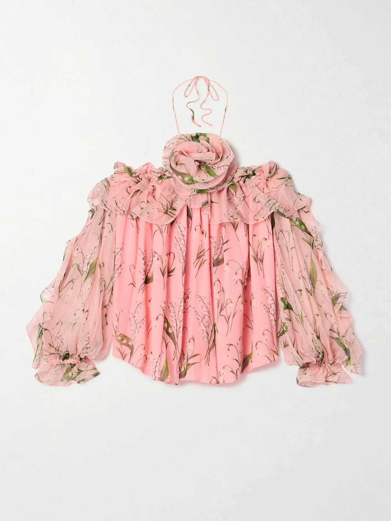 Carolina Herrera's blouse is designed with romantic details, like the floral print and dimensional rosette applique at the halterneck. It's made from swathes of airy georgette for a loose fit and has fluttering ruffles tracing the shoulder-baring neckline.