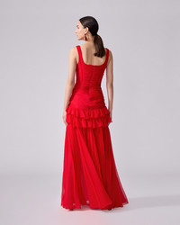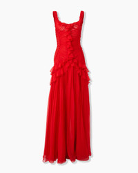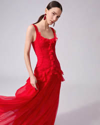 Make an entrance in this flowing scarlet gown crafted from beautifully soft silk-chiffon. The form-fitting bodice is pleated by hand and edged with delicate ruffles, flaring out to a floor-sweeping hem. SKU P2511N706SCH SIZE & FIT Fitted bodice with A-line maxi skirt Lightweight silk-chiffon Model is 180 cm/ 5’11” and is wearing a US 2 Bust: 32" Waist: 23" Hips: 35" COMPOSITION & CARE 100% Silk Washing Instructions Dry Clean Only Made in United States of America