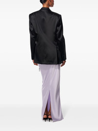 satin wrap blazer Highlights - Black - Satin finish - Wrap design - Curved peak - Shoulder pads - Long sleeves - English rear vents - Straight hem - Full lining Made in United States Composition pure cotton 53%, Acetate 47%