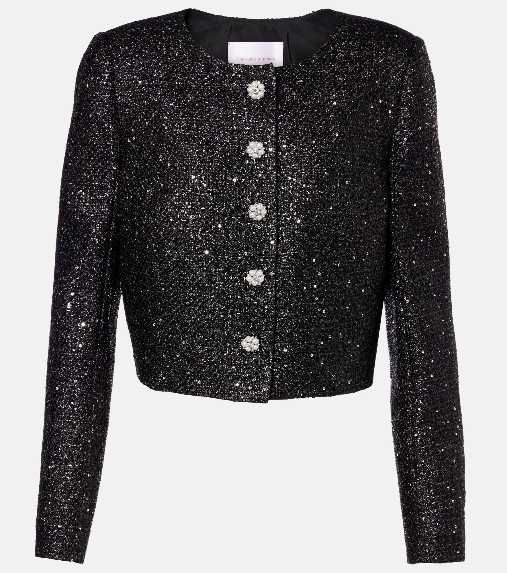 Crowned the best-dressed woman of all time, Carolina Herrera's namesake brand has a fashion prowess that reigns supreme. This tweed jacket is tailored to a cropped silhouette and features sequins, a button-through closure, and sculptural padded shoulders. Product Details - Material: 35% polyamide, 27% metallic fibres, 20% polyester, 9% wool, 9% acrylic - Care instructions: dry clean - Made in Italy - Color: black - Designer color name: Black - Item color: black - Lining: 100% polyester - Shoulder pads - Closure: buttoned front - Item number: P01103765 Size & Fit - True to size - Shoulder pad inserts - Straight fit - Non-stretchy fabric - Cropped - The model seen in the picture is 178cm-5'10" and wearing a size US 4