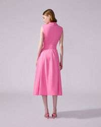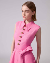 A classic point collar and decorative gold-tone buttons complement this sleeveless midi dress crafted from textured twill. Runway style Decorative gold-tone ball buttons Removable tie belt Side pockets Concealed zip closure at the back Lined SKU S2511N556CWL SIZE & FIT Fitted bodice with A-line midi skirt, removable belt Midweight cotton-blend twill Model is 178cm/ 5’10” and is wearing a US 2 Bust: 31" Waist: 23" Hips: 34" COMPOSITION & CARE 59% Viscose, 41% Cotton Washing Instructions Dry Clean Only Made in Italy