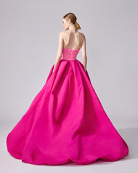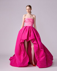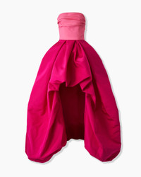 This colorblocked silk-faille gown stuns with a voluminous, high-low skirt that reveals a flash of leg at the front. A pleated bodice and elegant train complete this showstopping style. Bubble hem at front Concealed zip fastening at back SKU P2511N709SFA SIZE & FIT Close-fitting through bodice, voluminous high-low ball skirt Midweight silk-faille Model is 178cm/ 5’10” and is wearing a US 2 Bust: 31" Waist: 23" Hips: 34" COMPOSITION & CARE 100% Silk Washing Instructions Dry Clean Only Made in United States of America