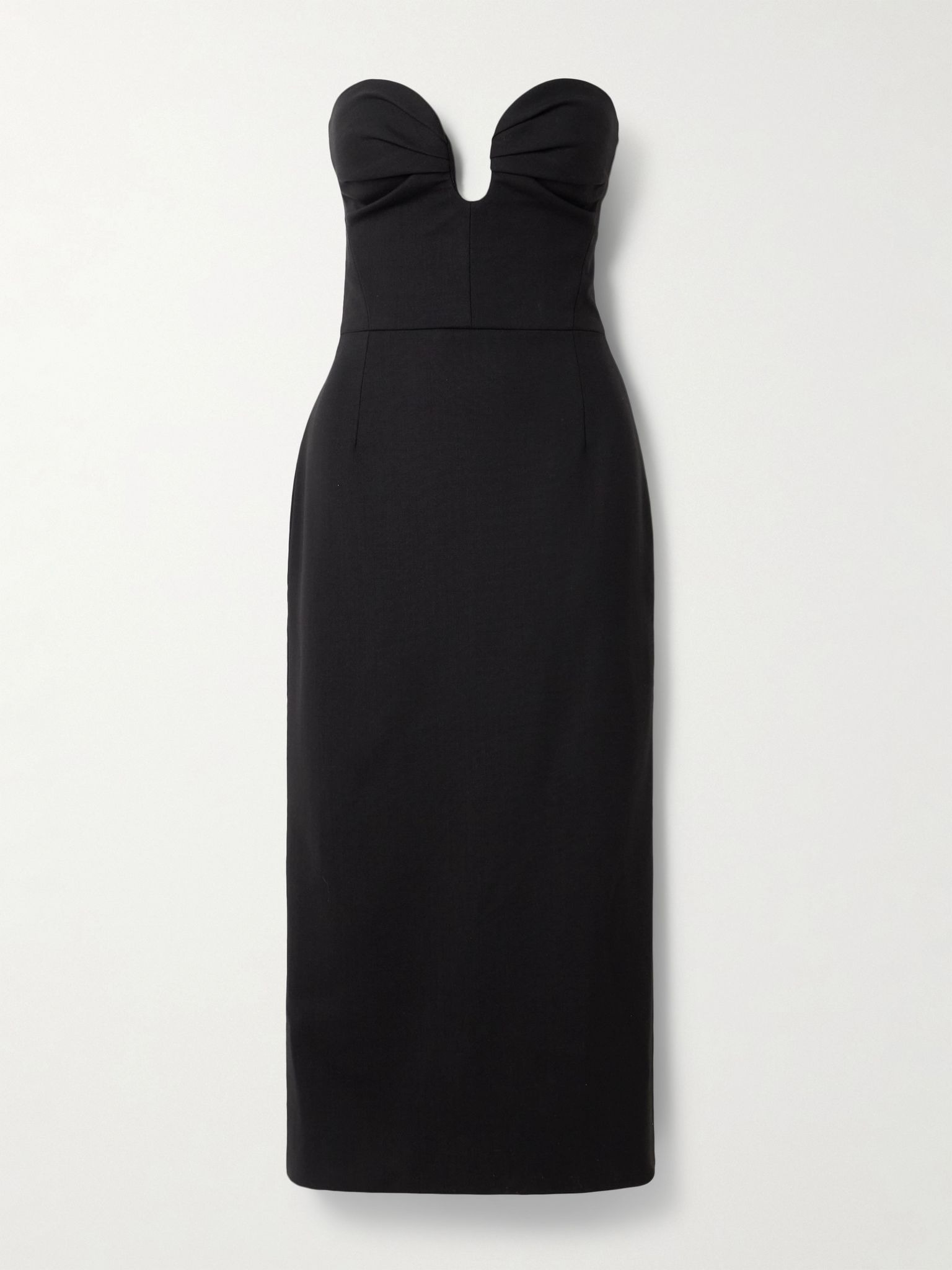 Carolina Herrera's midi dress captures the brand's timeless, elegant aesthetic. Made from a wool-blend, it's defined by a deep, ruched neckline and is cut to sculpt your figure with a boned bodice and nipped-in waist. Style yours with heels and sparkling drop earrings. Size & Fit - Fits true to size, take your normal size - Designed for a slim fit - Mid-weight, non-stretchy fabric - Model is 177cm/ 5'10" and is wearing a US 2 Model measurements: - Bust: 75cm/ 30” - Waist: 61cm/ 24” - Hip: 91cm/ 36” Details & Care - Black wool-blend - Concealed hook and zip fastening at back - 97% virgin wool, 3% elastane - Fully lined