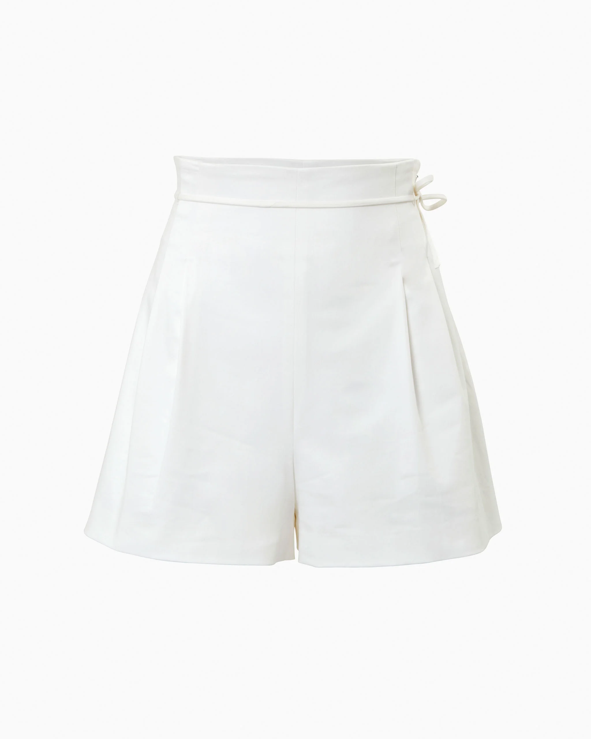 A string tie accentuates the high waist of these flared shorts, cut from cotton-sateen with accordion pleating at the sides. Runway style Removable string belt Concealed zip fastening at the side SKU E2411N411STS SIZE & FIT High-waisted, relaxed fit, removable string belt Stretch-cotton sateen Model is 178cm/ 5’10” and is wearing a US 2 Bust: 31" Waist: 23" Hips: 34" COMPOSITION & CARE 97% Cotton, 3% Elastane Washing Instructions Dry Clean Only Made in United States of America