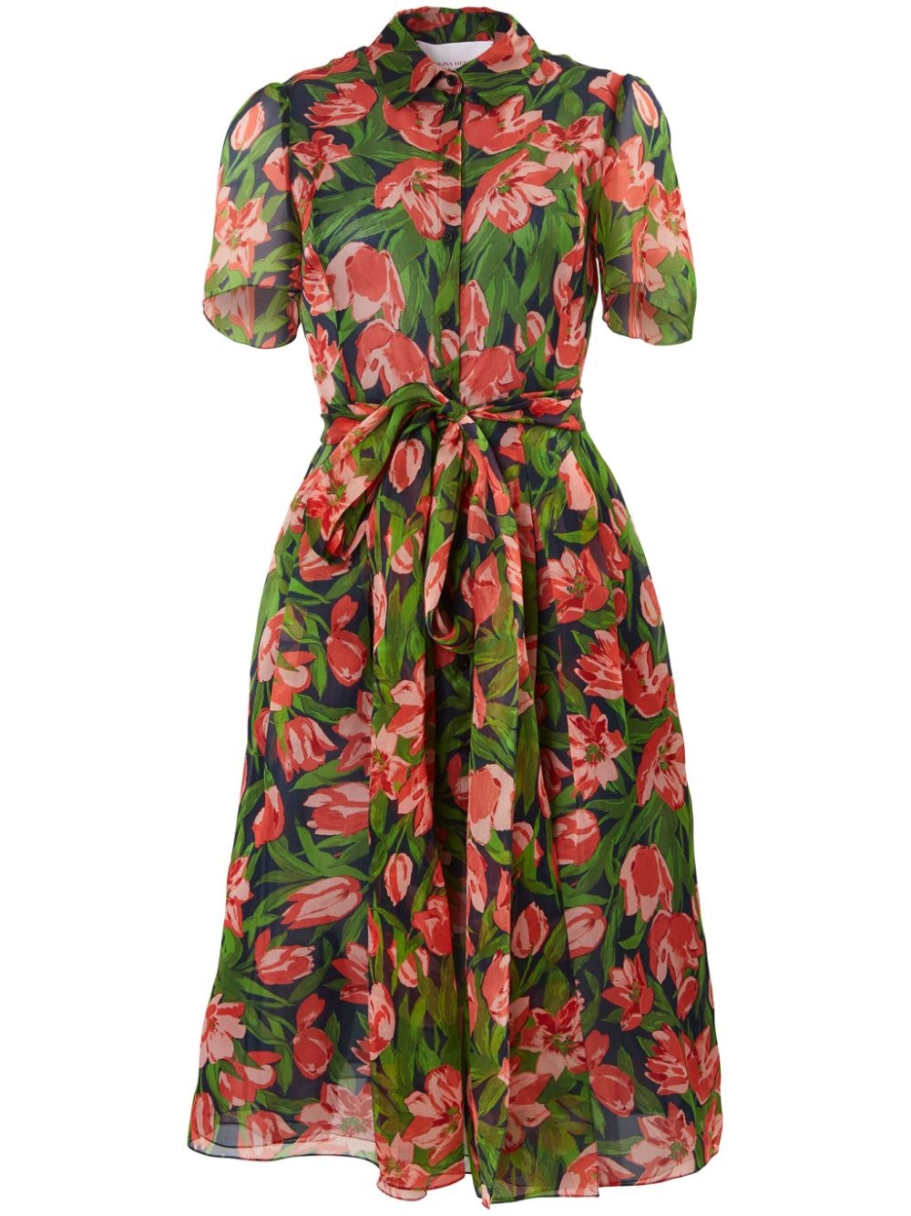 tulip-print silk shirt dress Highlights - Multicolour - Silk - Organza - All-over floral print - Classic collar - Front button fastening - Belted waist - Short sleeves - Mid-length - Straight hem Made in United States SIZE & FIT Measurement SLEEVE LENGTH 10.43 in(26.5 cm) HIPS 40.15 in(102 cm) LENGTH 44.88 in(114 cm) WAIST 25.19 in(64 cm)