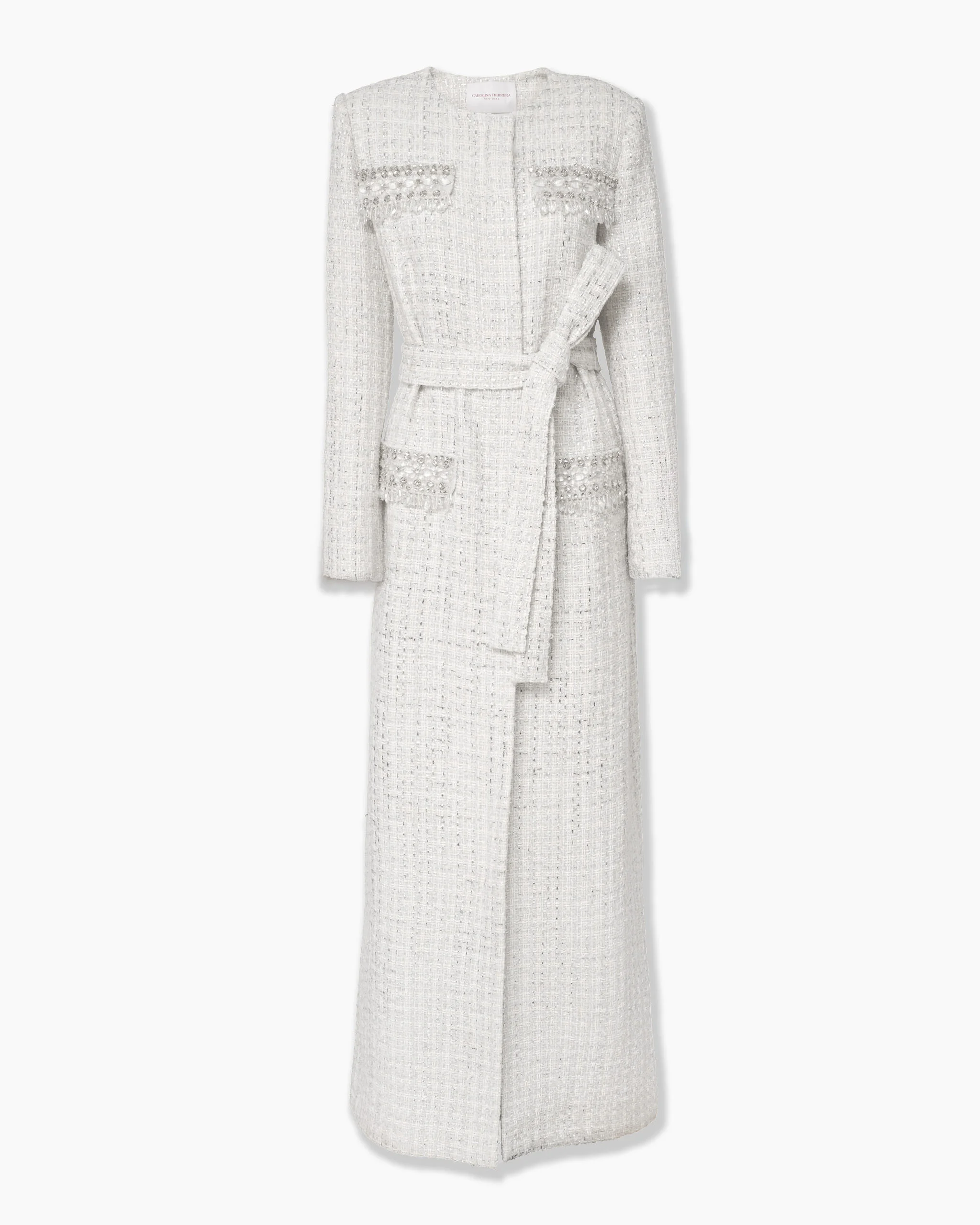 Elevate any ensemble with this floor-length coat, exquisitely crafted from textured white and silver tweed. Crystal embellishments on the cuffs and pockets provide a glittering finish. Runway style Decorative chest pockets Self belt Concealed zip closure at the front SKU F2511E604FTD SIZE & FIT Relaxed, slightly-oversized fit Midweight tweed Model is 178cm/ 5’10” and is wearing a US 2 Bust: 31" Waist: 23" Hips: 33" COMPOSITION & CARE 28% Nylon, 21% Polyester, 20% Cotton, 14% Virgin Wool, 10% Viscose, 7% Acrylic Washing Instructions Dry Clean Only Made in Italy