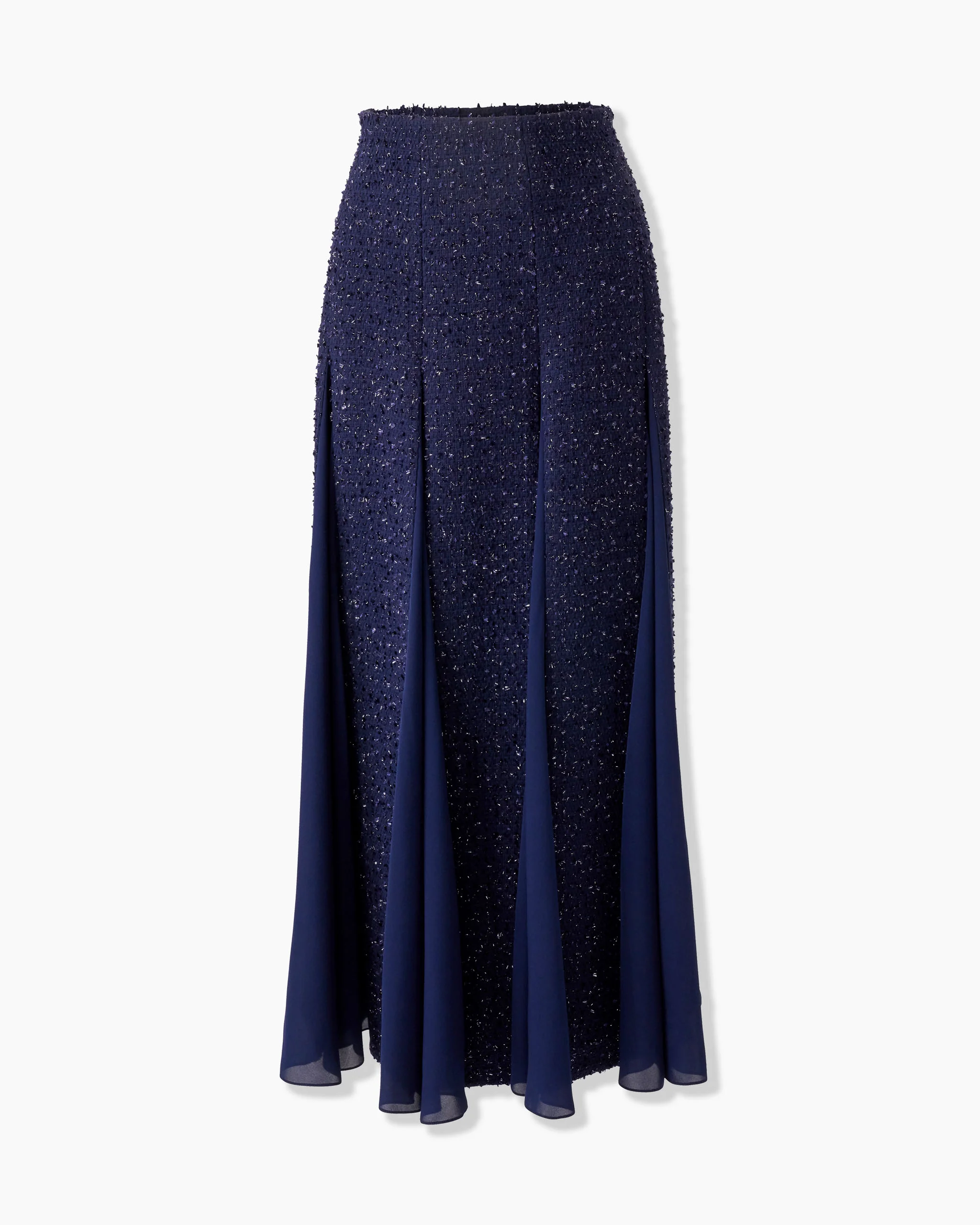 Lightweight georgette godets bring beautiful movement to this midi skirt, cut from shimmering cotton-blend tweed. Style it with our Tweed Peplum Top. Exposed zip fastening at the back SKU P2511N301CNT SIZE & FIT Loose fit with A-line midi skirt Midweight cotton-blend tweed Model is 178cm/ 5’10” and is wearing a US 2 Bust: 31" Waist: 23" Hips: 34" COMPOSITION & CARE 48% Cotton 32% Polyester 20% Nylon Washing Instructions Dry Clean Only Made in Italy