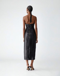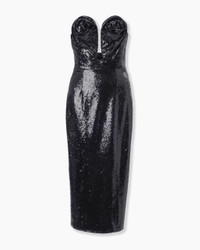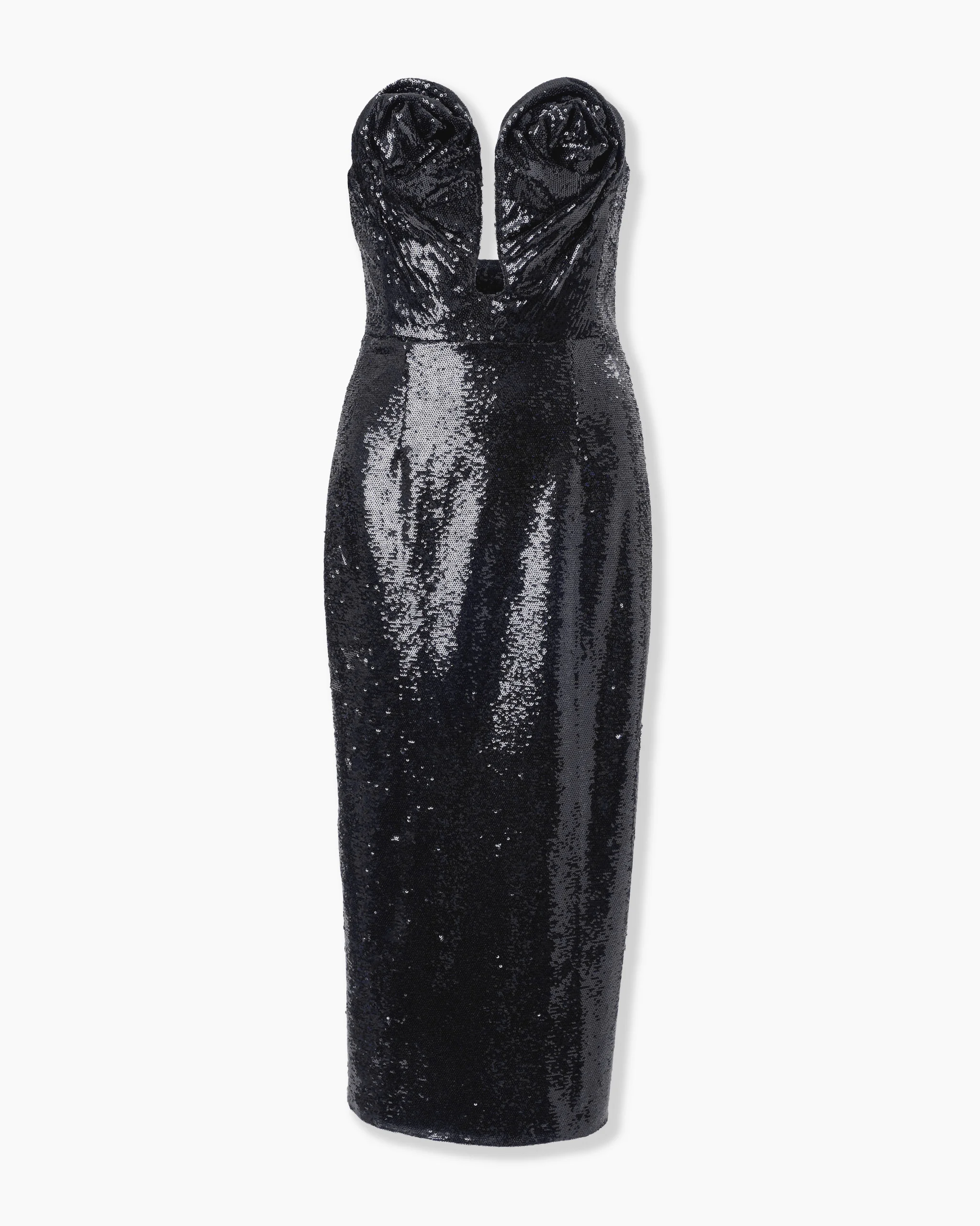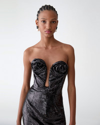 Covered in shimmering black micro-paillettes, this strapless midi dress features a plunging U-neckline and a close-fitting bodice adorned with twin rosettes. Strapless Wired U-neckline Exposed zip closure at the back SKU C2611N524SEQ SIZE & FIT Close-fitting column silhouette, midi length Midweight all-over sequin Model is 176cm/ 5’9” and is wearing a US 2 Bust: 29.5" Waist: 23" Hips: 33.5" COMPOSITION & CARE 100% Polyester Washing Instructions Dry Clean Only Made in United States of America