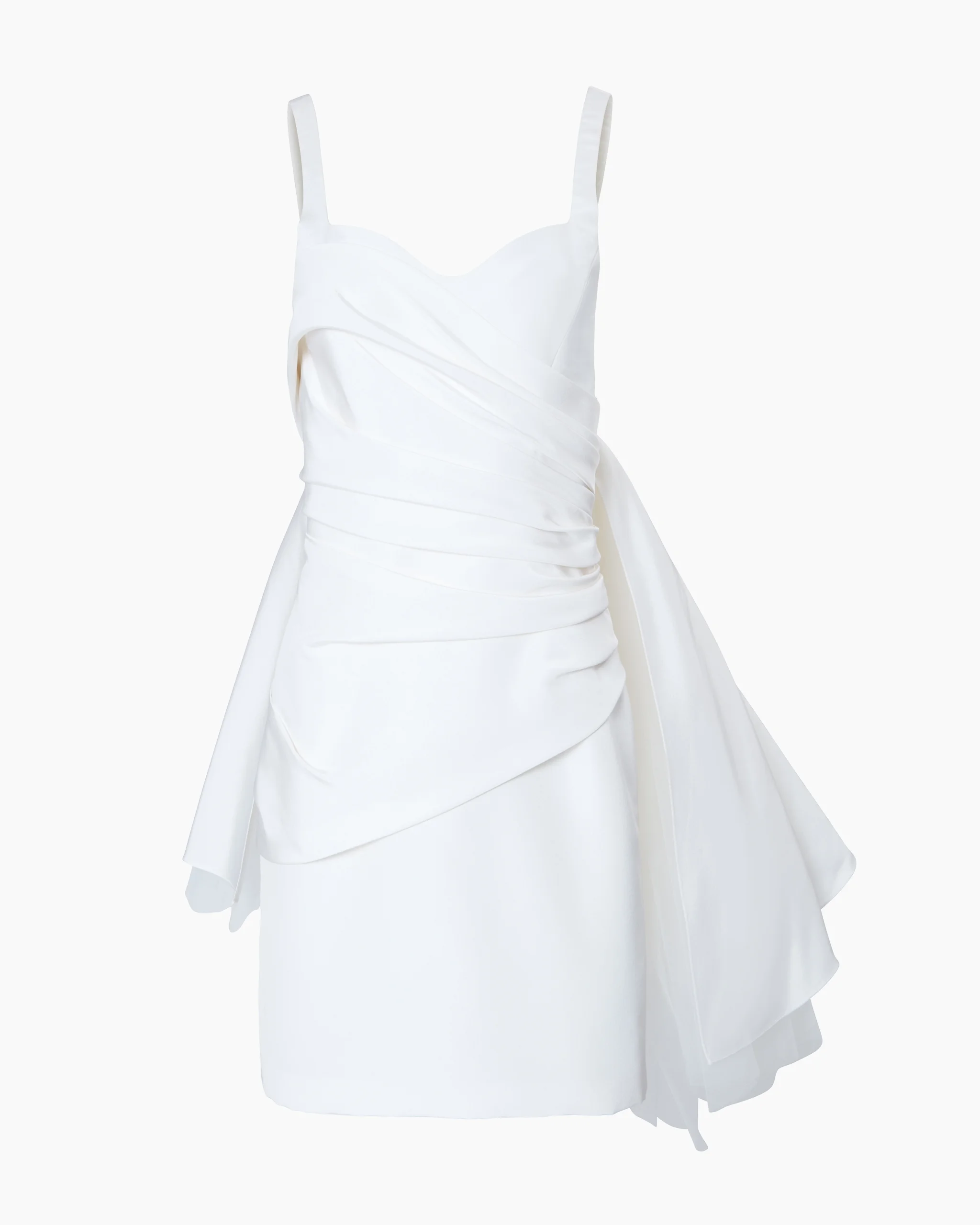 This stunning white silk faille dress features a draped front with a sweetheart neckline. A voluminous Watteau back lined with tulle will ensure you make a dramatic entrance down the aisle. Runway style Thin straps Draped front Watteau with tulle Concealed zip fastening at back Lined Length shoulder to hem: 35.5cm Fit Fits true to size Model Measurements Model is 178cm/ 5’10” and is wearing a US 2 Composition 100% Silk Washing Instructions Dry Clean Only Made in USA SKU S2311N544SFA