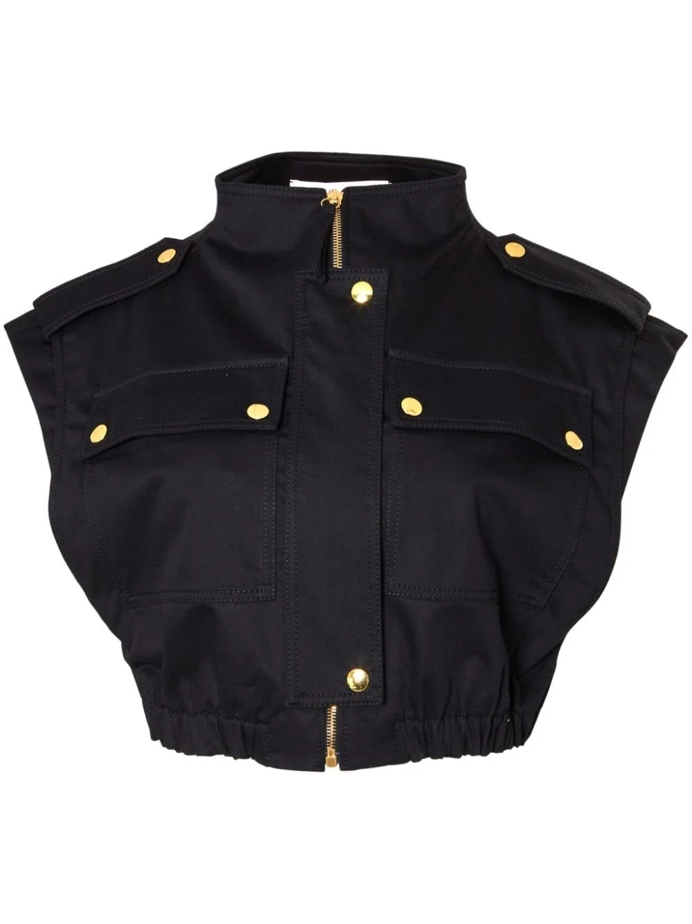 zip-up cropped cargo gilet Highlights - Black - Stretch-cotton - Gold-tone hardware - Stand-up collar - Front zip fastening - Sleeveless - Two chest flap pockets - Elasticated hem - Cropped Made in Italy Composition Cotton 100%, Elastane 100% SIZE & FIT Measurement LENGTH 16.92 in(43 cm) Shoulder Width 20.07 in(51 cm) BUST 34.64 in(88 cm) WAIST 28.34 in(72 cm) Washing instructions Dry Clean Only