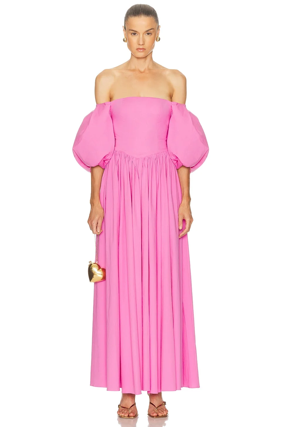 Details - Self & Lining: 98% cotton, 2% elastane - Dry clean only - Partially lined at bust - Pull-on styling - Off the shoulder styling - Puff sleeves - Pleated skirt - Heavyweight poplin fabric - Made in China - Our Style No. CLNC-WD211 - Manufacturer Style No. G002ISSE25