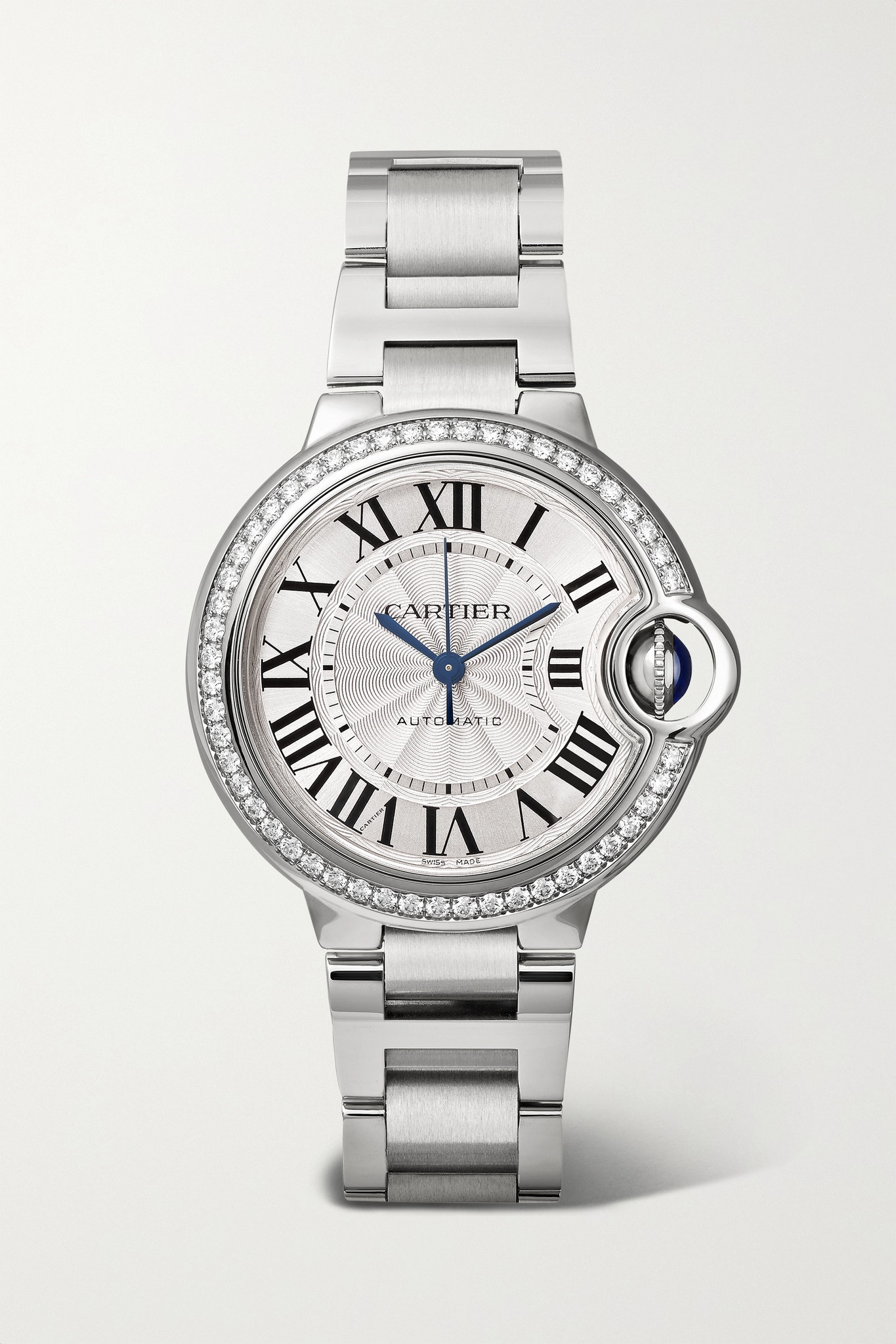 EDITORS'NOTES Cartier's 'Ballon Bleu de Cartier' watch gets its name from the cabochon nestled at the side that resembles a floating balloon and is encrusted with 50 brilliant-cut diamonds totaling 0.63-carats. This 33mm timepiece has been flawlessly assembled with polished stainless steel links that adjust at the back for a comfortable feel. The curved case has a silvered guilloché opaline dial and black Roman numerals centered with blued steel sword-shaped hands. It's the perfect gift to pass down for generations to come.<br><br><i>For warranty information, please refer to details & care</i> SIZE & FIT This item’s measurements are: - Circumference: 17cm / 6.7in DETAILS & CARE - Movement - Automatic movement Functions - Hour, minute and second hands Dial - Silvered guilloché opaline dial - Black Roman numerals and markers, blued steel sword-shaped hands Case - Stainless steel case - Brilliant-cut white diamonds, total weight: 0.63-carats - Crown for time adjustments and manual winding Bracelet - Stainless steel bracelet - Invisible clasp fastening Specifications - Case diameter: 33mm; case thickness: 9.96mm - Water resistance: 3 bar - Comes in a presentation box - Reference number: W6920071 - Manufactured in Switzerland Cartier creations are manufactured with the greatest care by Cartier workshops in the purest tradition of jewelry and watchmaking, thus giving each piece a unique character. As a result, information on the carat weights in relation to a model may vary slightly from one piece to another and are therefore given for information only. All Cartier watches still within the initial 2-year warranty period under the original International Limited Warranty will be eligible to benefit from a 6-year extension, for a total of 8 years warranty.