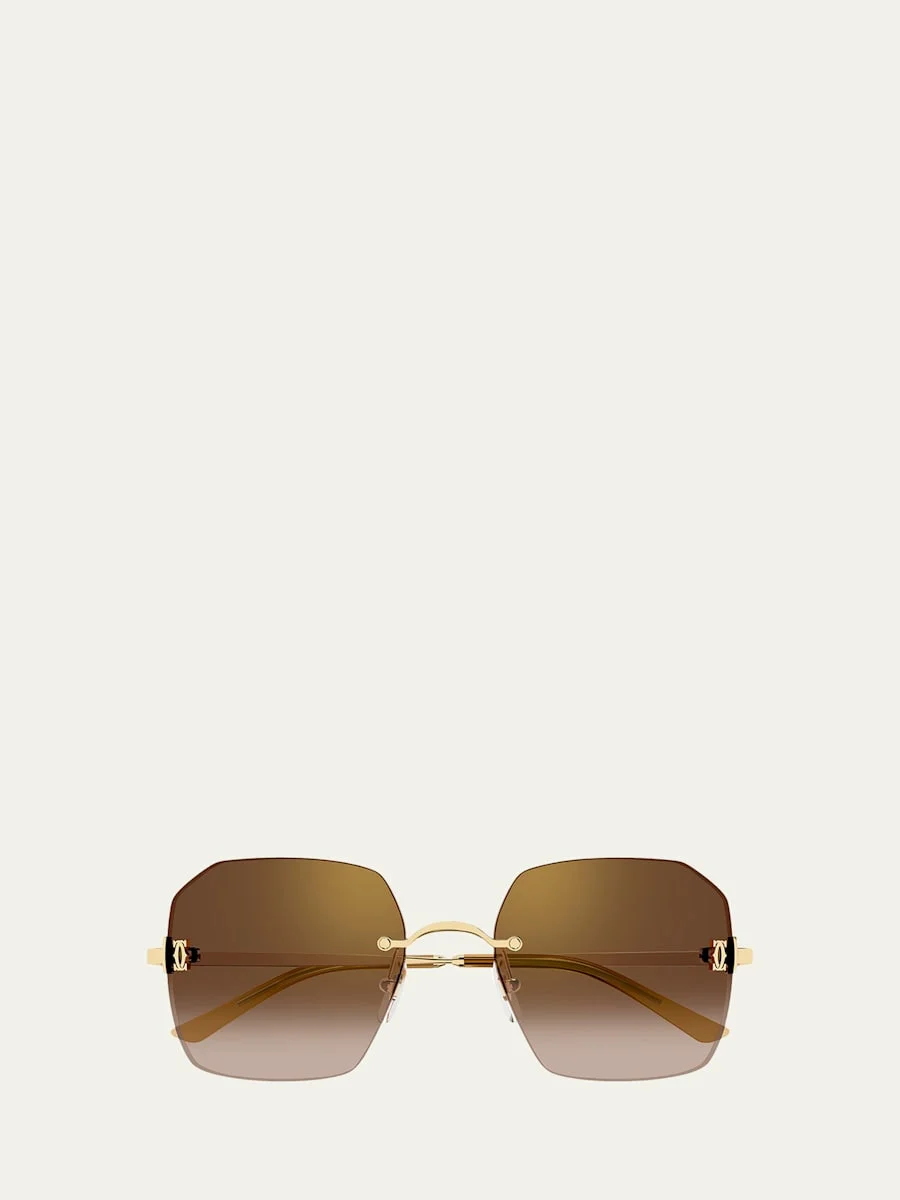 Cartier "CT0591S" rimless square sunglasses feature a smooth golden finish Eye/bridge/temple (in mm): 56-18-145 Mirrored gradient lenses Adjustable nose pads Engraved logo temples Thin, tapered arms Metal 100% UVA/UVB protection Made in France Online Inquiries: BGS21_D5GWD| Store Inquiries: #5414582