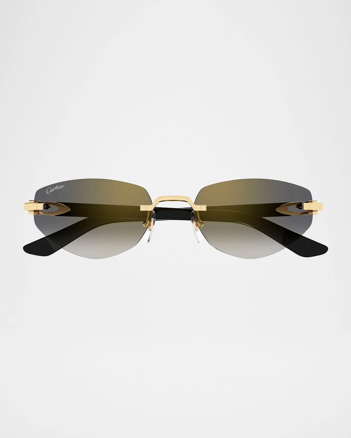 Cartier sunglasses from the C Decor showcase a rimless cateye silhouette with goldtone metal hardware Eye/bridge/temple (in mm): 5518140 Mirrored gradient lenses Adjustable nose pads Signature 'C' motif at the temples Thick, tapered arms 100% UVA/UVB protection Metal Made in France