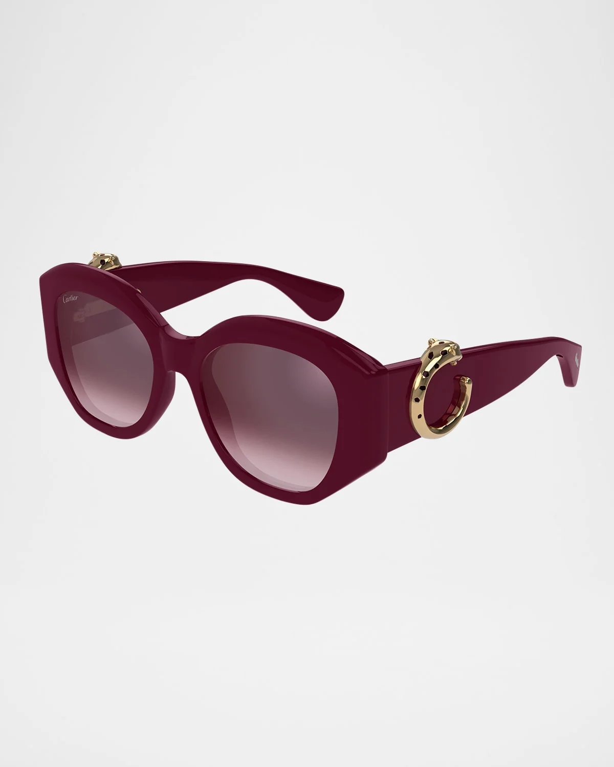 - Cartier butterfly sunglasses in acetate - Eye/bridge/temple (in mm): 53-19-140 - Gradient lenses; logo on corner - Saddle nose bridge - Metal panther C accents on temples - Wide, tapered arms - Acetate - 100% UVA/UVB protection - Made in Italy - Proposition 65 warning for California residents