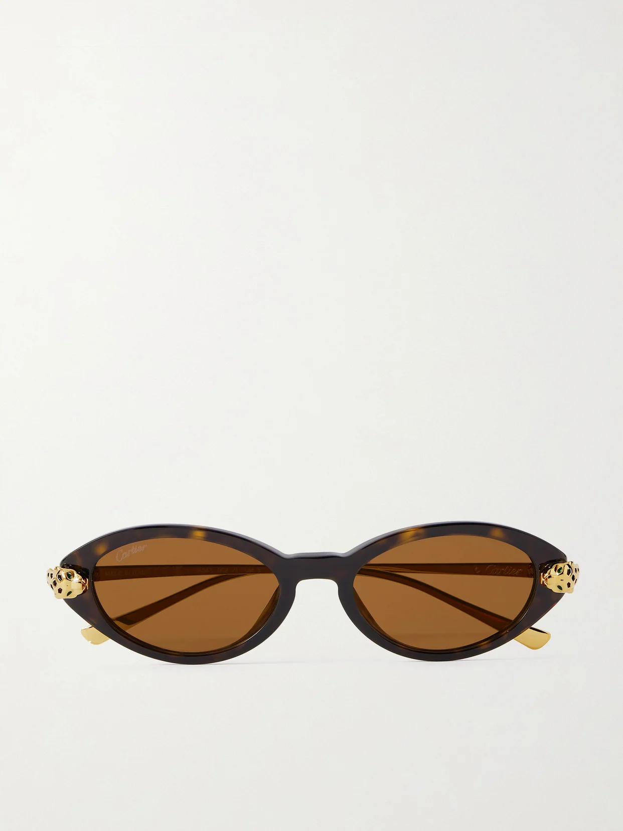 Untamable and elegant is how Cartier Eyewear describes its signature panther. Detailed with the namesake cat along the arms, these oval sunglasses are made from tortoiseshell acetate and gold-tone metal. Notice the intricately enameled spots and green crystal eyes.