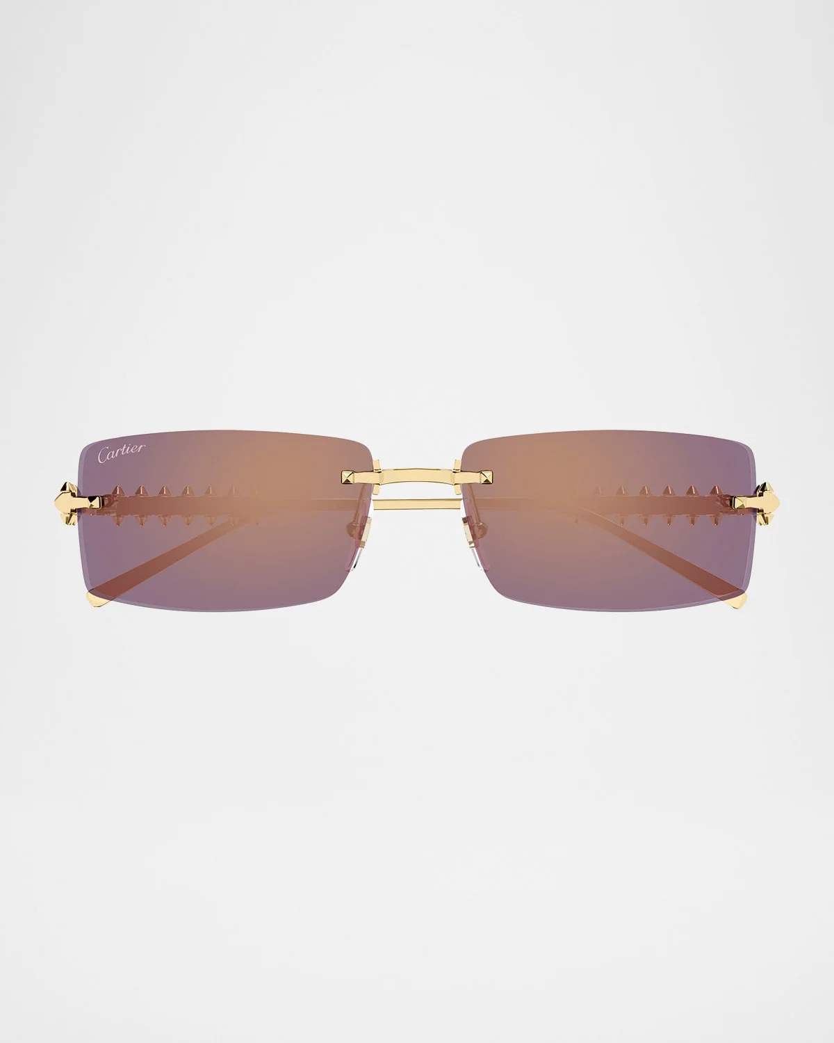 Cartier "CT0604S" sunglasses featuring a rimless metal frame with a smooth golden finish. Eye/bridge/temple (in mm): 57-17-140 Mirrored gradient lenses Adjustable nose pads Lasered logo on the right lens Studs and clous carres temples Metal alloy 100% UVA/UVB protection Made in Italy