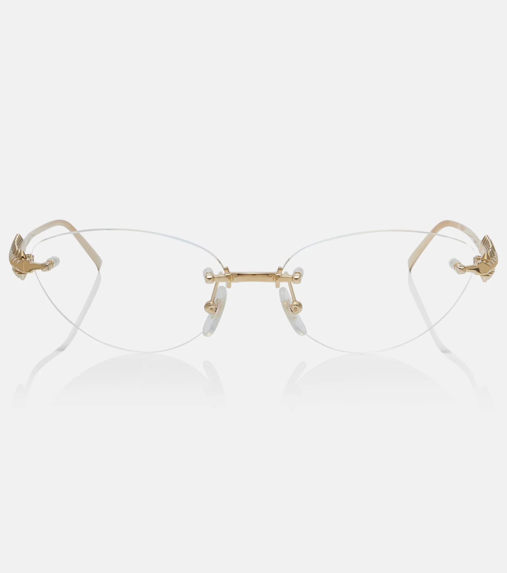 Cartier's expertise in jewelry-making extends to the Cartier Eyewear Collection, a line of exquisite styles for everyday wear. The Clash de Cartier glasses are a lightweight cat-eye design with gold-toned spiked temples. Product Details - Frame material: metal - Frame color: gold - Lens filter category 0 - Lens color: transparent - Made in France - Includes: case, cleaning cloth - The color of the case may vary - Item number: P01100154 Size & Fit - Lens width: 57mm-2.25" - Bridge size: 15mm-0.6" - Earpiece length: 140mm-5.5"