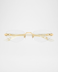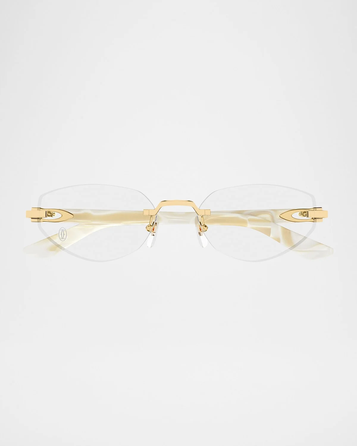 The "CT0609O003" metal optical glasses by Cartier sport the Elongated C de Cartier motif at the hinges, a staple of the Decor C Collection. Lens/bridge/temple (in mm): 5618145 Can be fitted with prescription lenses Rimless oval frames Saddle nose bridge Adjustable nose pads Thin, tapered acetate arms Made in Italy