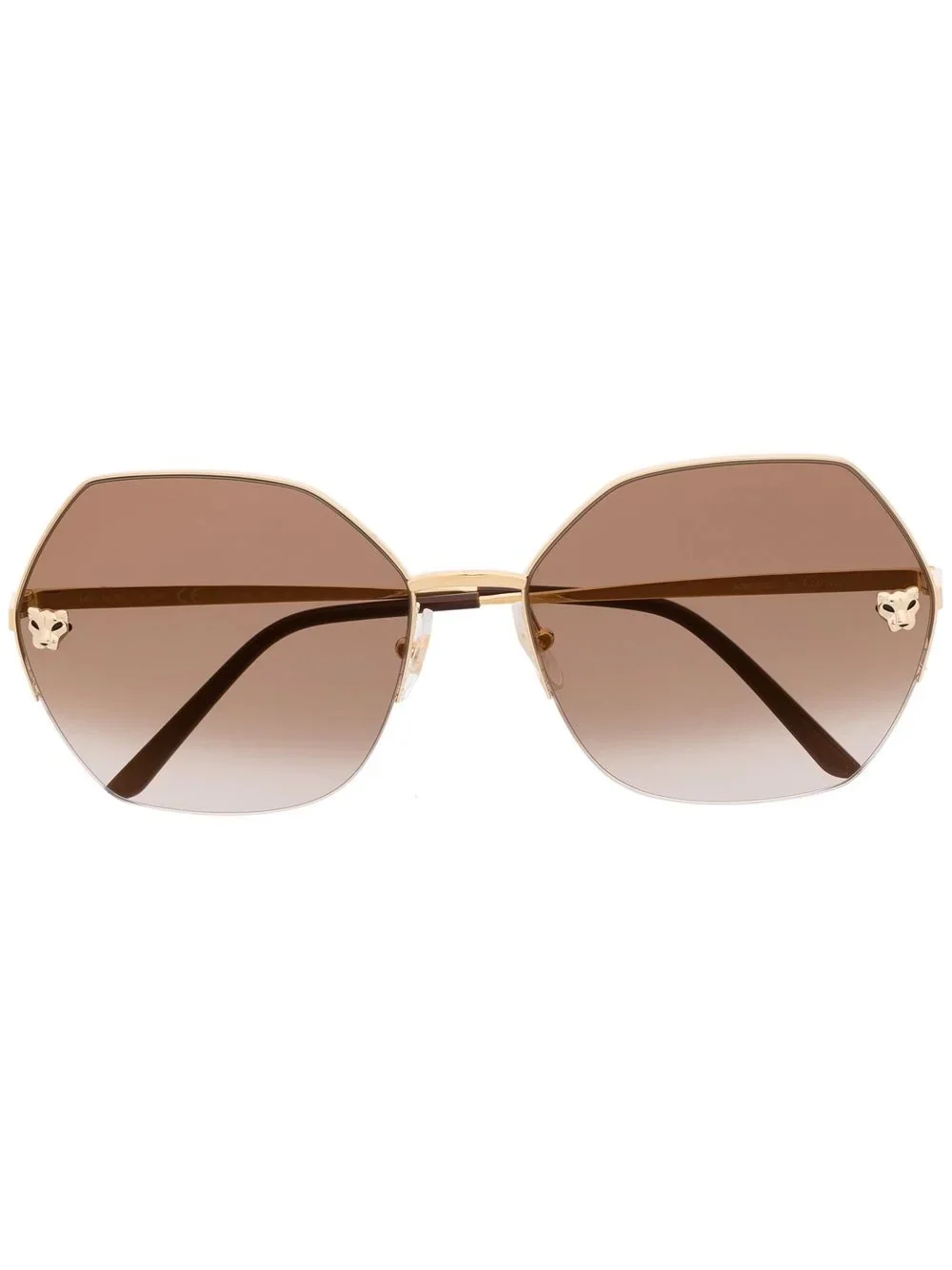 geometric-frame gradient-lense sunglasses Oversize geometric frames take the focus on these Cartier Eyewear sunglasses, creating an eye-catching finish for the pair. The opulent design is further enhanced by gold-tone decorative plaque detailing at the lenses. Made in France Composition Metal (Other) 90%, Acetate 10% SIZE & FIT Measurement Arm Length 5.51 in(14 cm) Bridge Width 0.66 in(1.7 cm) Lens Diameter 2.44 in(6.2 cm) Total Width 5.7 in(14.5 cm)